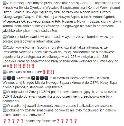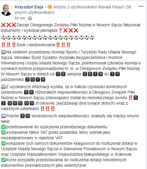 Radny Nowego Sącza Krzysztof Ziaja opublikował wczoraj na swoim profilu na Facebooku wpis, który zatytułował „Zarząd Okręgowego Związku Piłki Nożnej w Nowym Sączu fałszował dokumenty i wyłudzał pieniądze?”.Według radnego Okręgowy Związek Piłki Nożnej w Nowym Sączu zobowiązany został do niezwłocznego zwrotu 52 000,00 zł (…) Pośród 36 stwierdzonych nieprawidłowości, znalazły się między innymi przedstawienie do rozliczenia przerobionego dokumentu, wystawienie faktur VAT przez podatnika, który widniał jako niezarejestrowany w rejestrze VAT, wykazanie tych samych dokumentów księgowych do rozliczenia dotacji w Urzędzie Miasta Nowego Sącza, w Starostwie Powiatowym w Nowym Sączu oraz Urzędzie Marszałkowskim Województwa Małopolskiego w Krakowie, oraz liczne przypadki przedstawiania do rozliczenia dotacji nierzetelnych dokumentów poświadczonych jako autentyczne”.