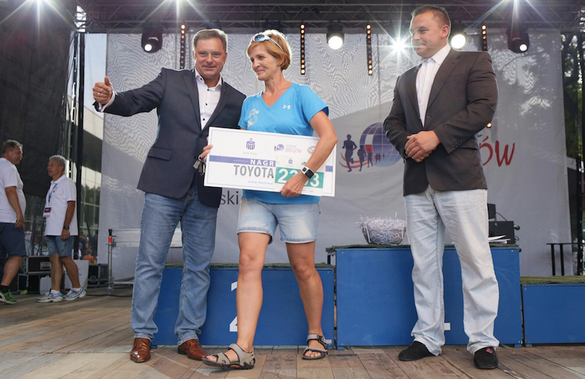 Pobiegłam w Krynicy dla zabawy. W pierwszym starcie udało się wywalczyć 3. miejsce w kategorii wiekowej, a teraz taka niespodzianka! – cieszyła się Pani Maria tuż po tym, jak odebrała kluczyki do Toyoty Yaris z rąk Mariusza Jurka – dyrektora generalnego PPL „Koral” oraz Piotra Gąsiorowskiego – dyrektora marketingu firmy.