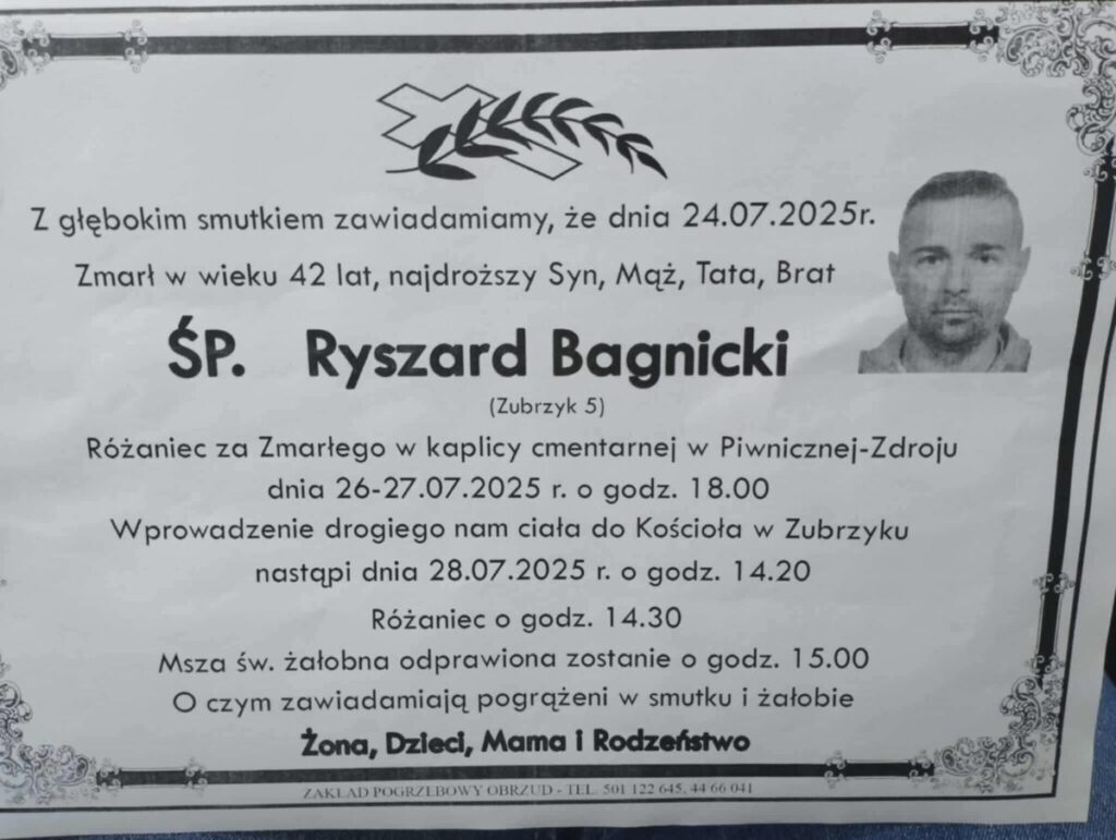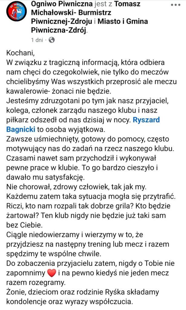 W Piwnicznej-Zdroju dotarła wczoraj (25 lipca) tragiczna wiadomość o śmierci Ryszarda Bagnickiego – piłkarza, członka zarządu klubu sportowego Ogniwo Piwniczna i aktywnego mieszkańca. Był znany z uśmiechu, życzliwości i gotowości do pomocy innym. Często sam zgłaszał się do prac na rzecz klubu, co dawało mu radość i satysfakcję.
