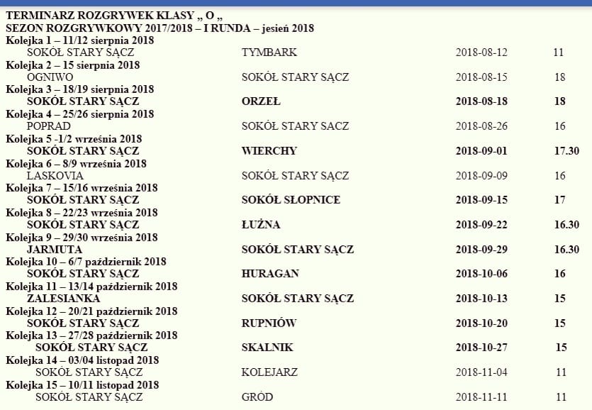 Znamy już harmonogram rozgrywek „okręgówki” w którym zagra zespół Sokół Stary Sącz. Pierwszy mecz starosądeczanie rozegrają na własnym boisku przy Bandurskiego, już 12 sierpnia o godzinie 11. Sokół podejmie zespół z Tymbarku.