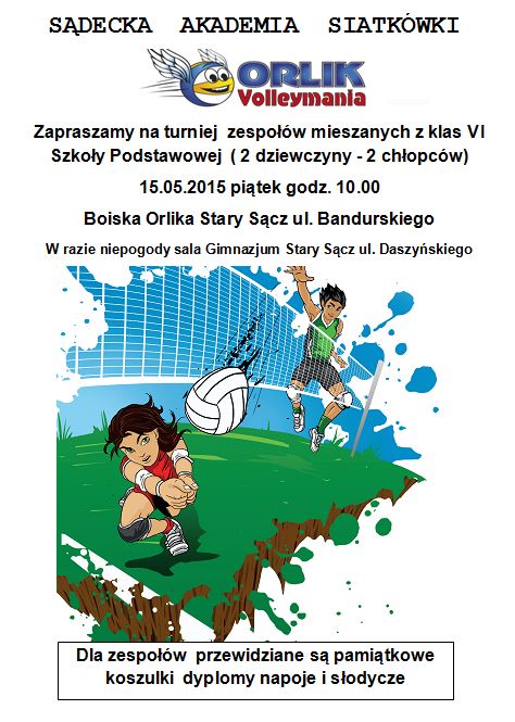 Kolejny Turniej organizowany przez Sądecką Akademie Siatkówki w Starym Sączu to „Orlik Volleymania”na który zapraszamy zespoły mieszane z klas VI Szkoły Podstawowej ( 2 dziewczyny – 2 chłopców)