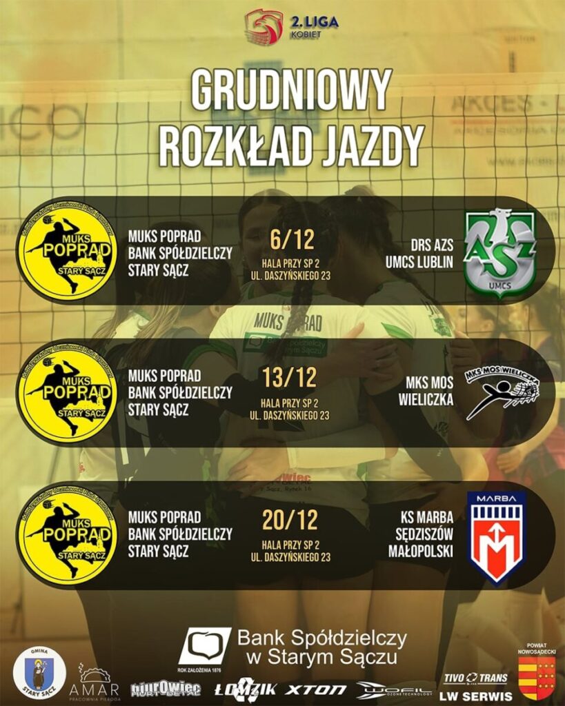 Grudzień zapowiada się wyjątkowo emocjonująco dla kibiców siatkówki w Starym Sączu. Fani MUKS Poprad będą mogli obejrzeć aż trzy domowe spotkania swojej drużyny, rozgrywane na hali sportowej przy ul. Daszyńskiego. To doskonała okazja, by wspólnie stworzyć gorącą atmosferę i wesprzeć miejscowe siatkarki w walce o ligowe punkty.