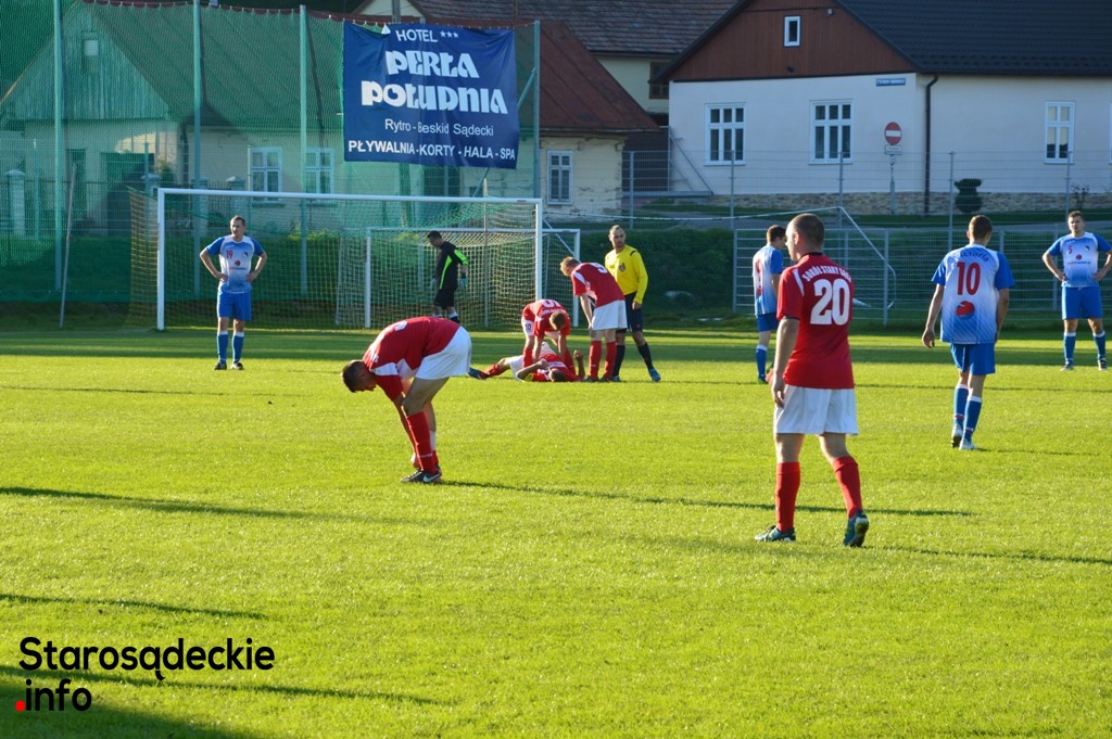 Dzisiejsze spotkanie na stadionie w Starym Sączu rozpoczęło się o godz. 16. Faworytem spotkania byli gospodarze. Nie zawiedli. Strzelanie rozpoczęło się w 31 minucie od samobója Victorii. W 39 minucie Ćwik pewnie wykorzystał rzut karny. Po tym golu, przewaga piłkarzy Sokoła była coraz bardziej widoczna, czego efektem była jeszcze jedna bramka „do szatni” Wójcika (44′). W drugiej połowie jedno trafienie dołożył ponownie Wójcik (51′) i Kozłowski w 81 minucie spotkania.