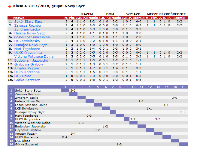 Piłkarze MKS Sokół wygrali na wyjeździe 4:0 z ULKS Korzenna i po drugiej kolejce zostali liderami tabeli klasy A. To pierwsze zwycięstwo w tym sezonie. W niedzielę piłkarze Sokoła zremisowali na swoim boisku z Zawiszą Rożnów (2:2).