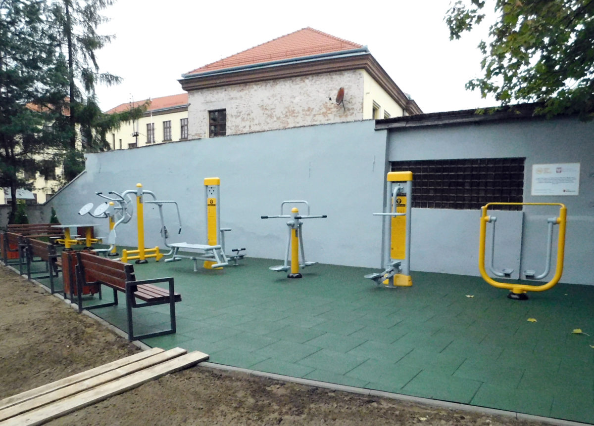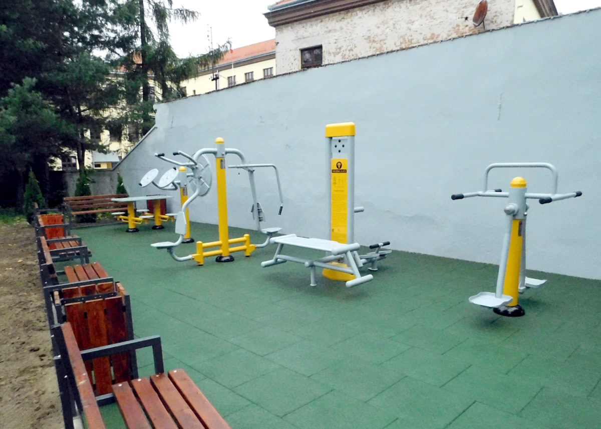 Oprócz siłowni, na zewnątrz są również stoły do gry w szachy i chińczyka oraz stojak na rowery.