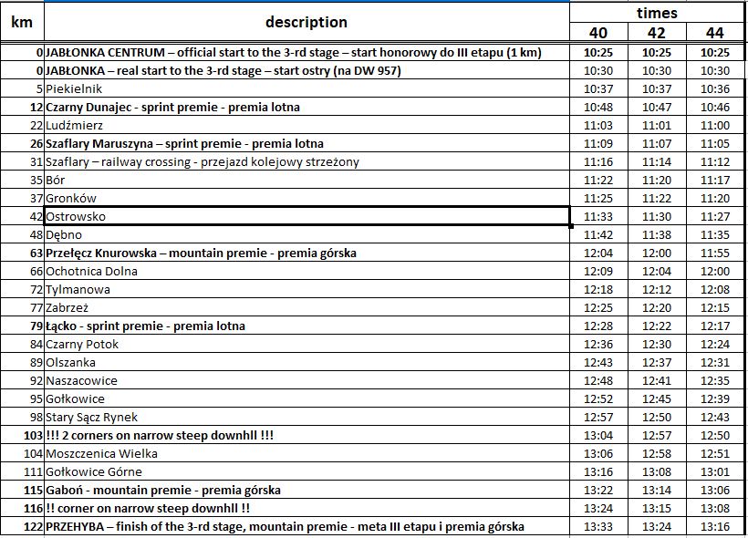Publikujemy minutową rozpiskę, która pozwoli zorientować się, o jakiej godzinie należy spodziewać się przejazdu peletonu. Rozpiska została przygotowana dla trzech wariantów: kolarzy jadących z prędkością 40, 42 oraz 44 kilometrów na godzinę. Za przygotowanie harmonogramu odpowiada organizator Małopolskiego Wyścigu Górskiego, czyli Małopolski Związek Kolarski. Dyrektorem sportowym Wyścigu jest Marek Kosicki.