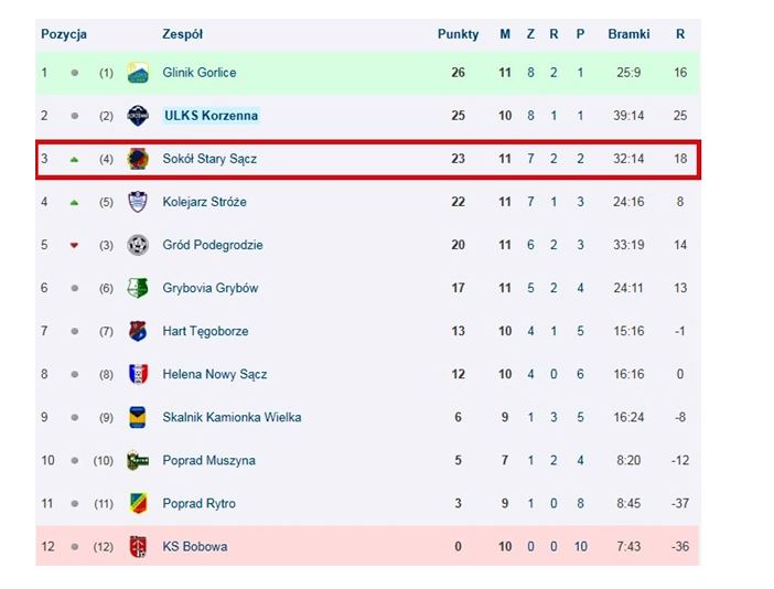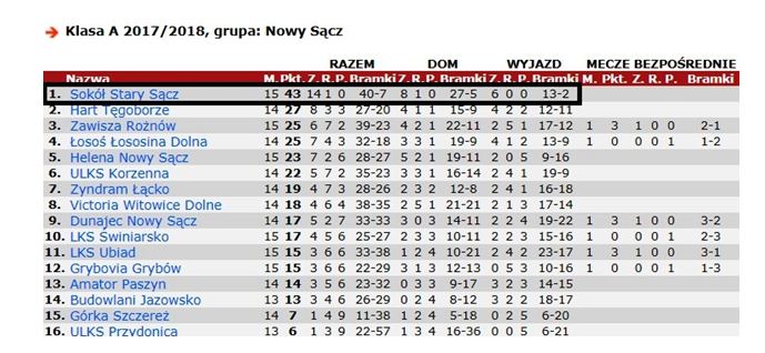 W 15 meczach Sokół stracił tylko 2 pkt, remisując pierwsze spotkanie z Zawiszą Rożnów. Kolejne spotkania to już dominacja Sokoła.