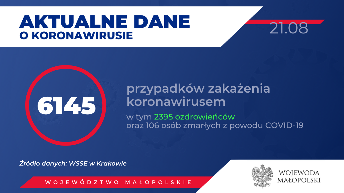 Ostatnie badania laboratoryjne potwierdziły zakażenie koronawirusem SARS-CoV-2 u kolejnych 158 osób. To 82 kobiety i 76 mężczyzn, w wieku od niespełna miesiąca do 92 lat, z Krakowa (58 osób), powiatu nowotarskiego (19), limanowskiego (10), krakowskiego (9), tarnowskiego (9), nowosądeckiego (8), oświęcimskiego (7), wadowickiego (7), wielickiego (7), brzeskiego (4), Nowego Sącza (4), powiatu tatrzańskiego (4), bocheńskiego (3), myślenickiego (3), gorlickiego (2), miechowskiego (2), chrzanowskiego (1) i olkuskiego (1). Aktualnie 12 osób jest hospitalizowanych, pozostałe przebywają w izolacji. Obecnie w Małopolsce zakażenie koronawirusem zostało potwierdzone u 6145 osób.