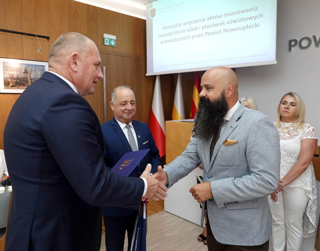 Starosta nowosądecki Tadeusz Zaremba wraz z przewodniczącym Rady Powiatu Nowosądeckiego Markiem Pławiakiem wręczyli wczoraj (29 sierpnia) 15 nauczycielom szkół powiatowych akty mianowania na wyższe stopnie zawodowe. Pedagodzy złożyli również ślubowanie.