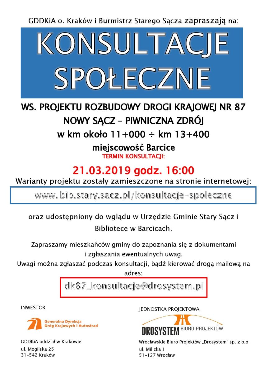 Generalna Dyrekcja Dróg Krajowych i Autostrad w Krakowie i Burmistrz Starego Sącza zapraszają mieszkańców gminy, organizacje pozarządowe oraz inne zainteresowane osoby i podmioty do udziału w konsultacjach społecznych. GDDKiA chce poprawić bezpieczeństwo na DK 87, która prowadzi od Nowego Sącza do granicy słowackiej w Mniszku nad Popradem. Przebudowane zostaną jej fragmenty w Barcicach i Młodowie.Przygotowano warianty przebiegu trasy, a mieszkańcy mogą zgłaszać swoje uwagi.