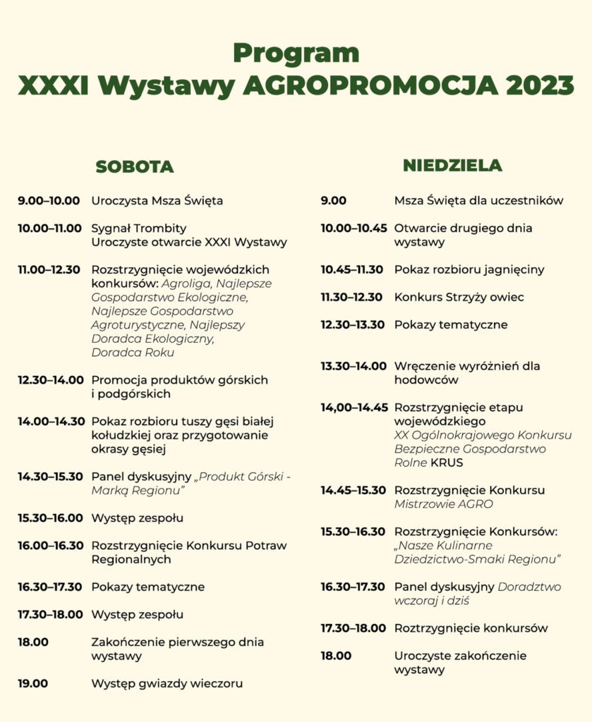 Podczas wystawy zostaną ogłoszone wyniki wielu wojewódzkich konkursów organizowanych przez MODR Karniowice – W sobotę: Agroliga, Najlepsze Gospodarstwo Ekologiczne, Najlepsze Gospodarstwo Agroturystyczne, Najlepszy Doradca Ekologiczny, Doradca Roku, Potrawy Regionalne. W niedzielę: Rozstrzygnięcie Konkursu Gazety Krakowskiej Mistrzowie AGRO i „Nasze Kulinarne Dziedzictwo – Smaki Regionu”.