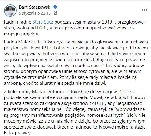 Bartosz (Bart) Staszewski, działacz społeczny i aktywista LGBT „znakuje” miejscowości, które przyjęły uchwały i określiły się strefami wolnymi od „ideologii LGBT”. Zdjęcie ze Starego Sącza jest już dwudziestą siódmą fotografią aktywisty. Wcześniej była to Łososina Dolna, gdzie radni gminy jako jedni z pierwszych w Polsce przyjęli rezolucję dotyczącą „powstrzymania ideologii LGBT”. Za tę akcję najprawdopodobniej Bart Staszewski stanie przed sądem, bo zajście jako wykroczenie drogowe na policję zgłosił poseł PiS Arkadiusz Mularczyk.