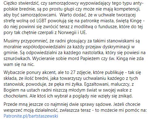 –Z Bogiem na ustach radni niszczą młodym świat w swojej walce z chochołami” – pisze Staszewski w poście na Facebooku – Musimy przypomnieć, że radni głosujący za takimi stanowiskami są moralnie współodpowiedzialni za każdy przejaw dyskryminacji w gminie. Są odpowiedzialni za każdego nastolatka, który się powiesi na sznurówkach. Wycieranie sobie mord Papieżem czy św. Kingą nie zda wam się na nic.