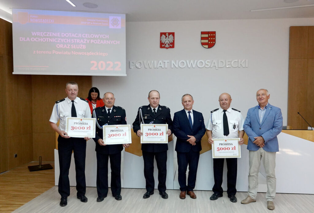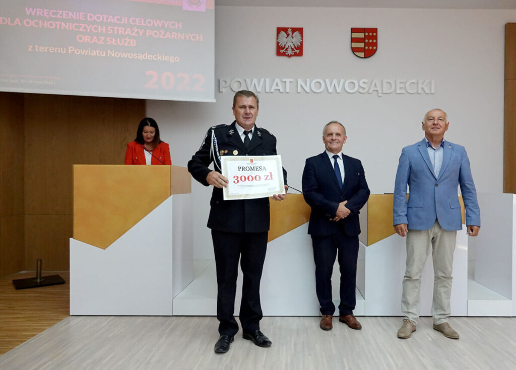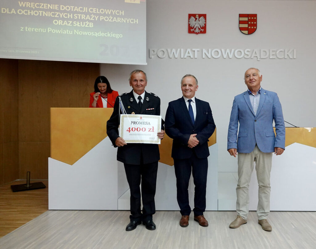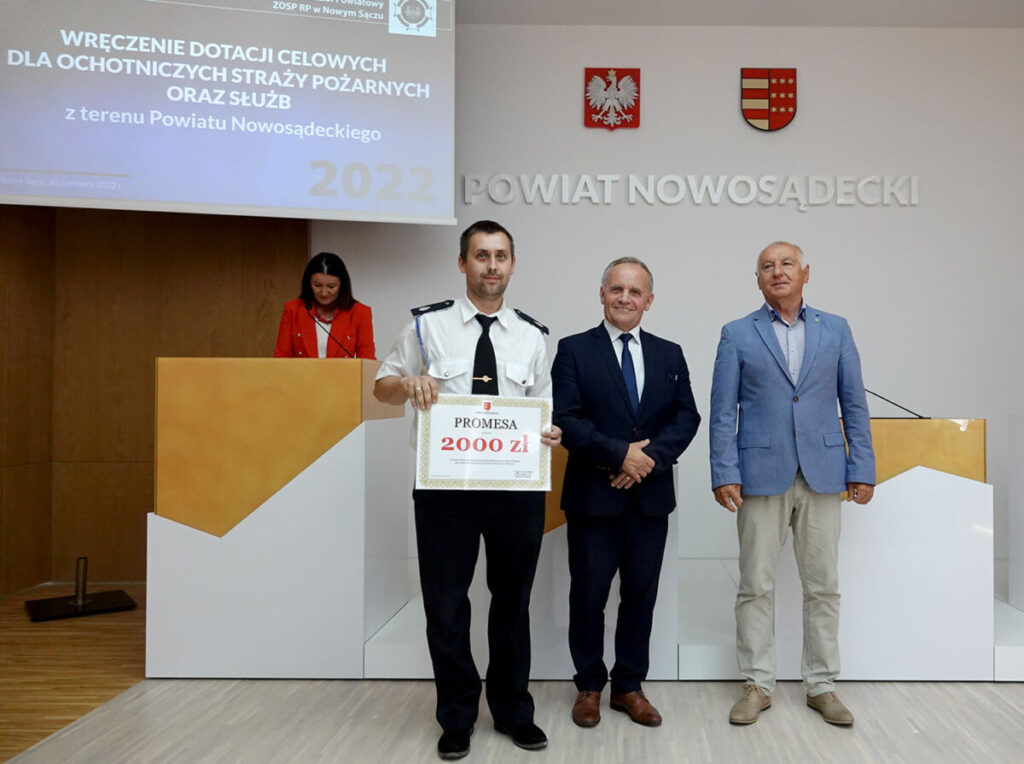 Starosta nowosądecki Marek Kwiatkowski wraz z wicestarostą Antonim Koszykiem, wręczył promesy dla ochotniczych straży pożarnych i służb działających na terenie Powiatu Nowosądeckiego. W tym roku druhowie zwrócili się do starosty o dofinansowanie zakupu m.in.: ubrań koszarowych dla młodzieżowych drużyn strażackich, pomp elektrycznych, kombinezonów dla grup ratownictwa wysokościowego, rękawic technicznych, hełmów i obuwia strażackiego, pompy zanurzeniowej, drabiny i wyważacza do drzwi.