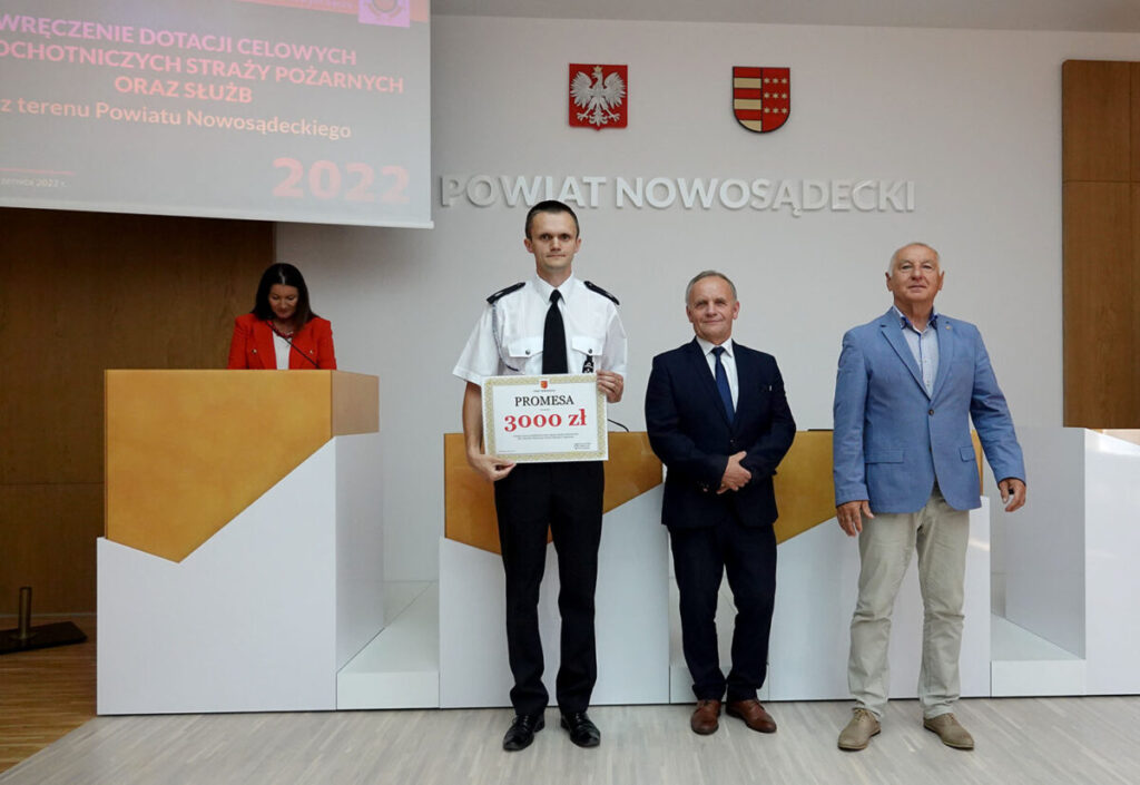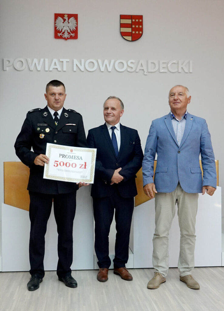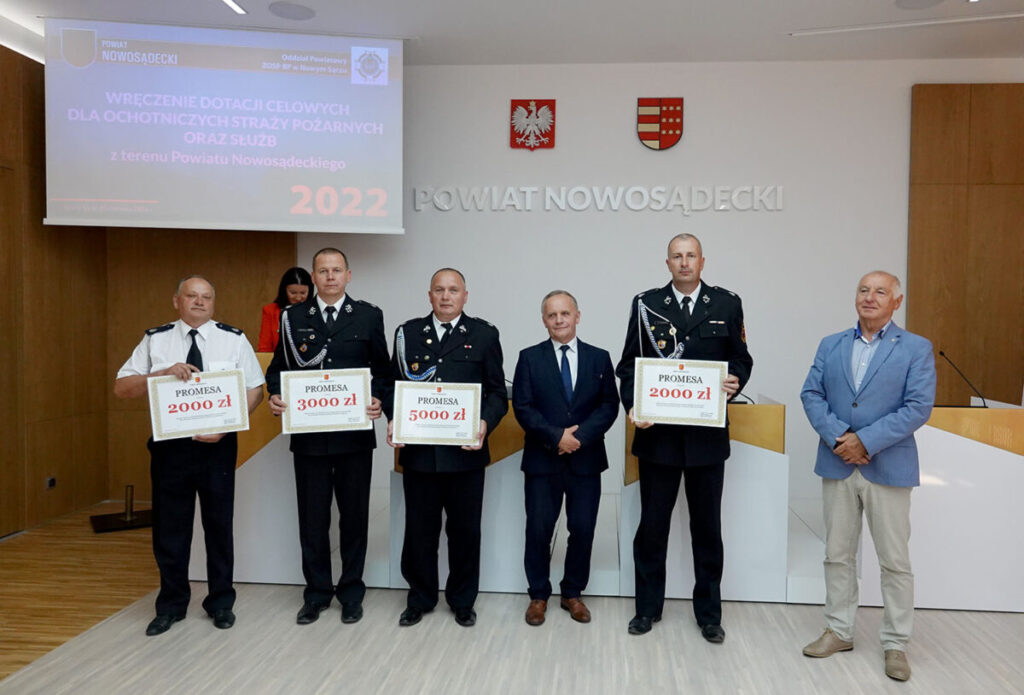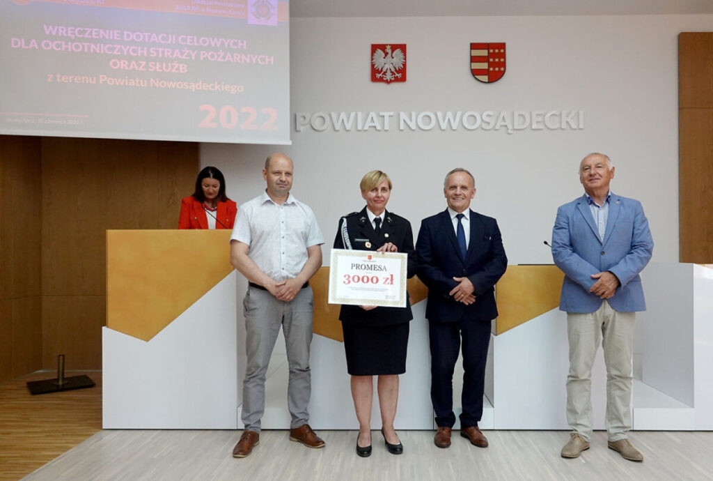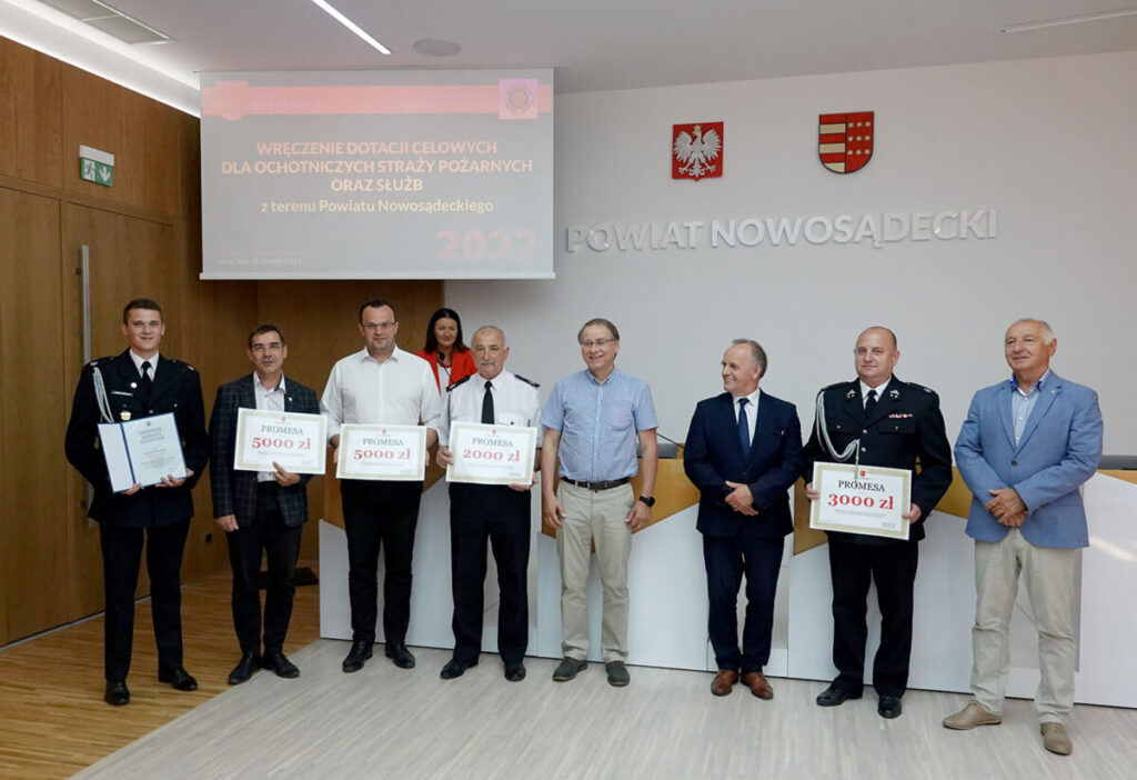 Starosta nowosądecki Marek Kwiatkowski wraz z wicestarostą Antonim Koszykiem, wręczył promesy dla ochotniczych straży pożarnych i służb działających na terenie Powiatu Nowosądeckiego. W tym roku druhowie zwrócili się do starosty o dofinansowanie zakupu m.in.: ubrań koszarowych dla młodzieżowych drużyn strażackich, pomp elektrycznych, kombinezonów dla grup ratownictwa wysokościowego, rękawic technicznych, hełmów i obuwia strażackiego, pompy zanurzeniowej, drabiny i wyważacza do drzwi.