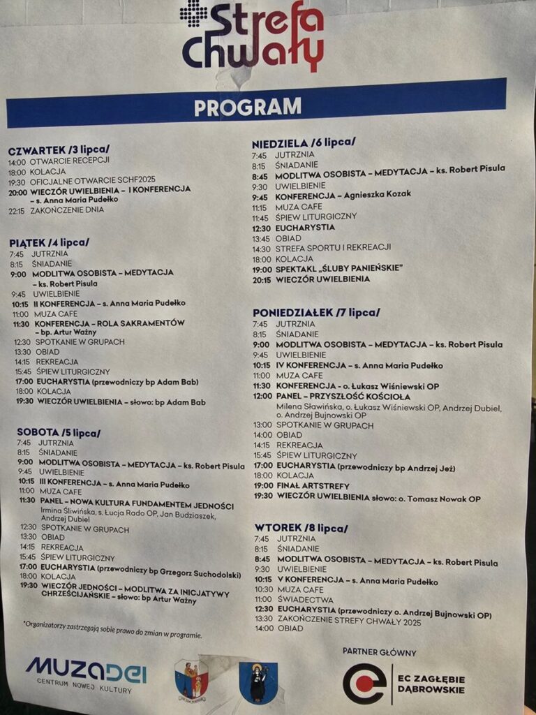 Każdy dzień przynosi bogaty program: Eucharystię, inspirujące konferencje oraz poruszające wieczory uwielbienia, prowadzone przez zespół Strefy Chwały. Szczególnym momentem tegorocznego spotkania będzie modlitwa jedności za inicjatywy chrześcijańskie w Polsce, która odbędzie się 5 lipca o godz. 19:30, z udziałem przedstawicieli licznych wspólnot i ruchów kościoła w Polsce.