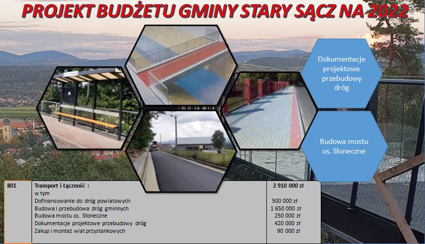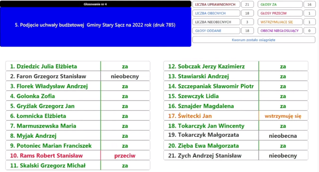 Stary Sącz ma uchwalony budżet na 2022 rok. Gmina zamierza zrealizować 42 zadania inwestycyjne na łączną kwotę ponad 43 mln złotych. Będzie to budżet inwestycyjny i mocno turystyczny. Podczas głosowania 3 radnych było nieobecnych (Faron Grzegorz, Tokarczyk Małgorzata i Zych Andrzej), jeden wstrzymał się od głosu ( Świtecki Jan) a jeden radny zagłosował przeciw uchwale budżetowej (Rams Robert).