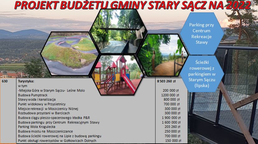 Gmina Stary Sącz chce zainwestować ponad 8 milionów w turystykę. Pieniądze pochodzą z Rządowej Tarczy dla Gmin Górskich. Z tych środków powstanie Pumptrack i Skatepark, ale również ścieżki rowerowe, parkingi miedzy innymi przy stawach i w Woli Kroguleckiej, punkt widokowy w Przysietnicy i zaplecze sportowo- turystyczne w Barcicach, Moszczenicy Niżnej i Gołkowicach Dolnych. W proponowanym budżecie jest także ciąg pieszo-spacerowy czyli kładka z Park&Ride.