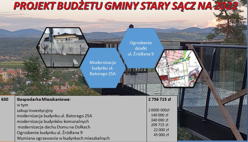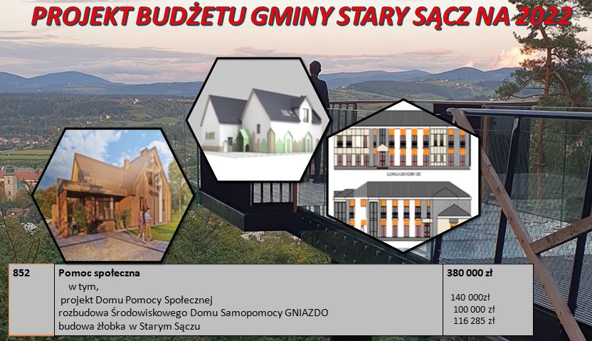 Z kolei gospodarka mieszkaniowa to remonty budynków gminnych i zakupy gruntów pod inwestycję. Natomiast w pomocy społecznej dokończone zostaną projekty Domu Pomocy Społecznej, rozbudowana zostanie siedziba Stowarzyszenia na Rzecz Osób Niepełnosprawnych Gniazdo w Cyganowicach i projekt żłobka w Starym Sączu. Gmina zaprojektuje także budynek WDK w Skrudzinie i zaplecze w Mostkach.