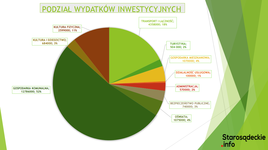 Większość bieżących wydatków, bo aż 34% „pochłonie” oświata (29 175 250) i gospodarka komunalna -22% (18 989 775). Jeśli jednak chodzi o inwestycje to prym wiedzie gospodarka komunalna (52%) transport i łączność (18%) oraz kultura fizyczna (11%)