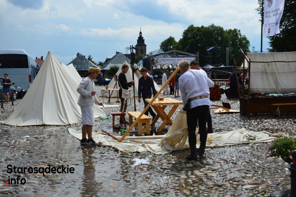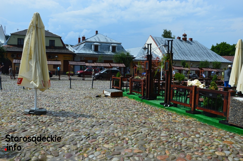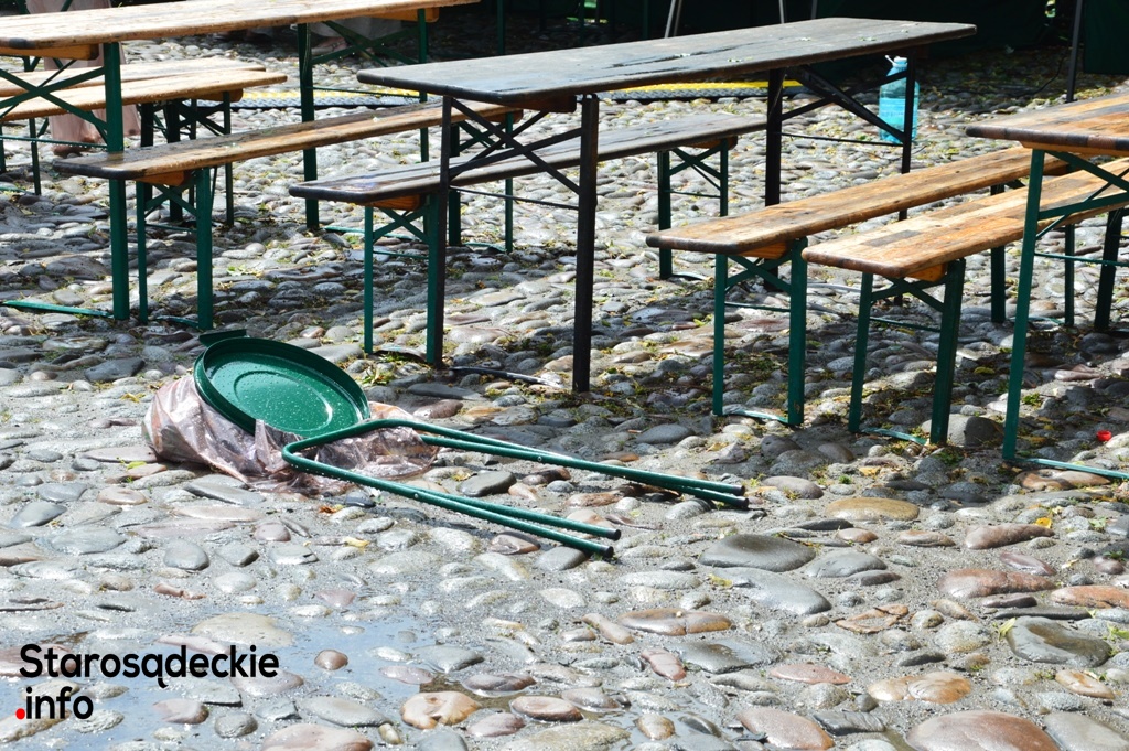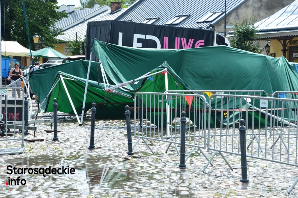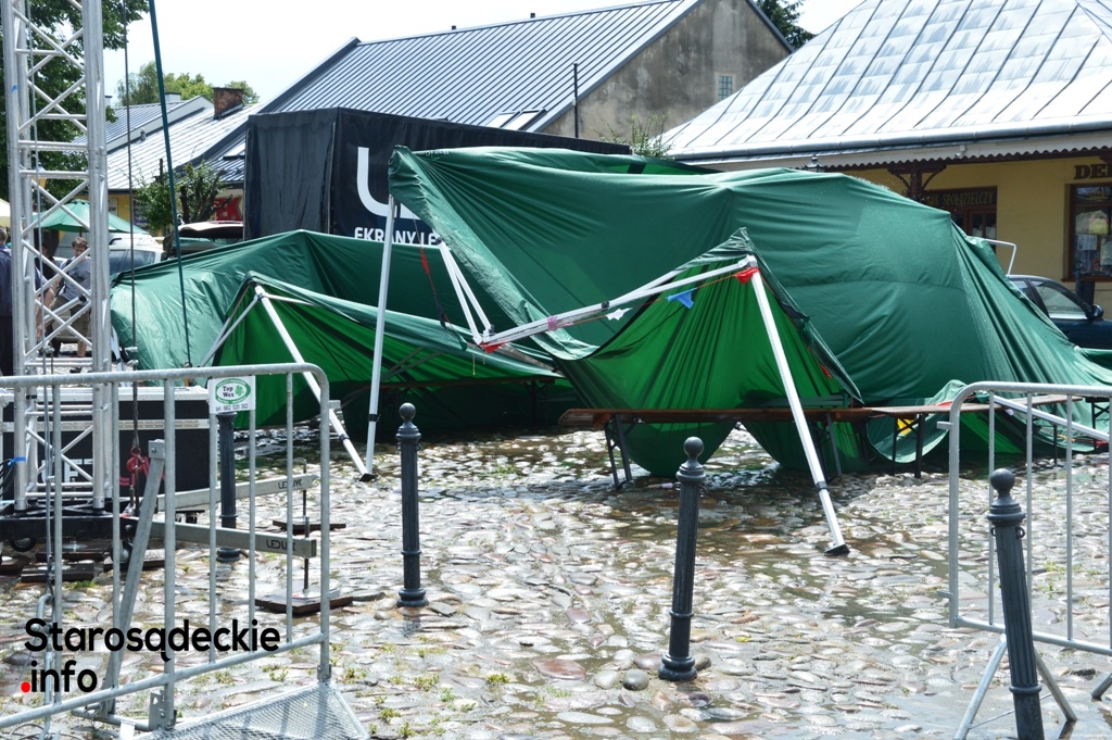 Wystarczył kwadrans ulewy, żeby ulice w Starym Sączu zamieniły się w koryta rzeczne a wiatr porywał i łamał namioty rozłożone podczas Jarmarku św. Kingi. Pogoda nie oszczędziła także gospodarstw domowych. Spływająca ulicami woda podtopiła kilka domów.