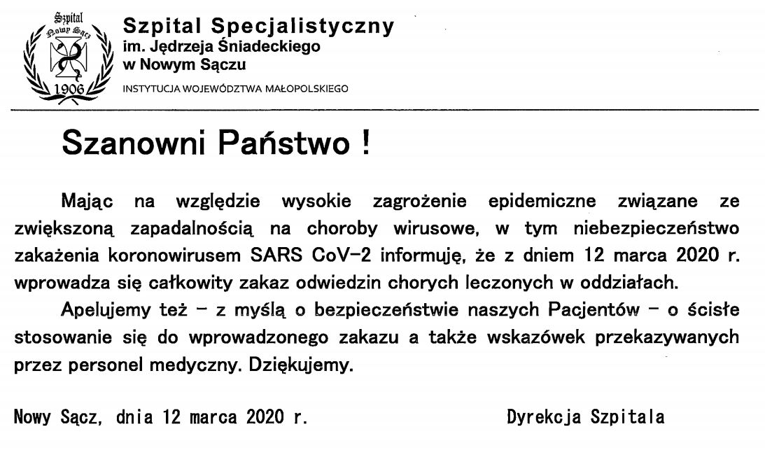 Całkowity zakaz odwiedzin w sądeckim szpitalu!