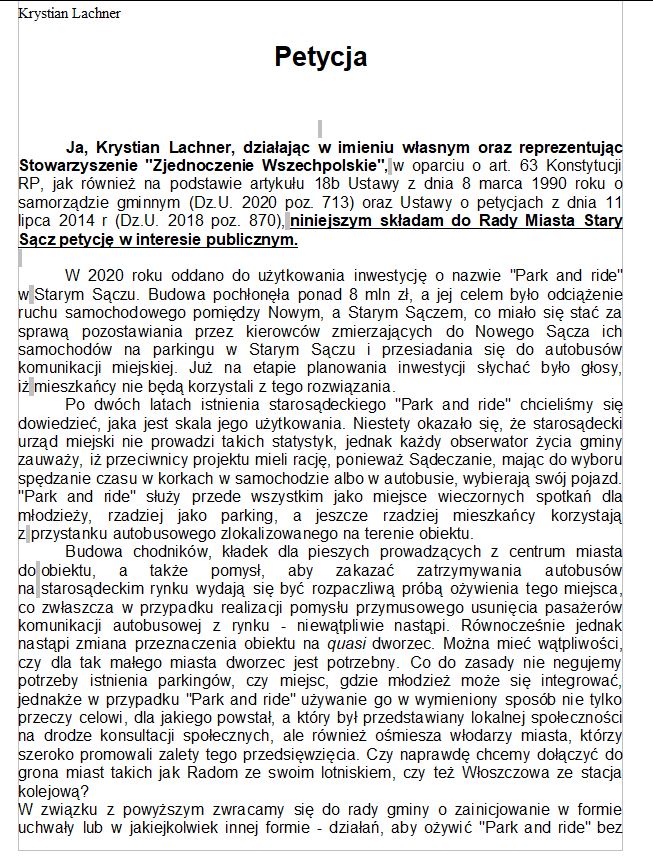 Stowarzyszenie Zjednoczenie Polskie złożyło do Urzędu Miejskiego w Starym Sączu petycję ws. Park&Ride. Chcą ożywienia inwestycji.