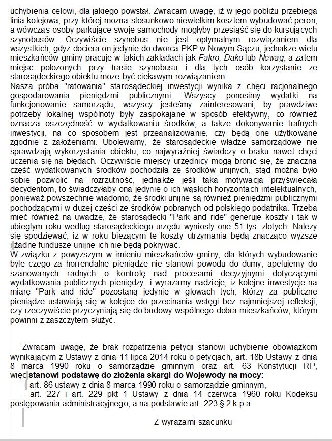 Budowa pochłonęła ponad 8 mln zł, a jej celem było odciążenie ruchu samochodowego pomiędzy Nowym, a Starym Sączemmówi Mariusz Rogowski, rzecznik nowosądeckiego koła Ruchu NarodowegoCzas pokazał, że inwestycja nie jest użytkowana zgodnie z założeniami, ponieważ służy ona przede wszystkim jako miejsce wieczornych spotkań lokalnej młodzieży, rzadziej jako parking, a jeszcze rzadziej mieszkańcy korzystają z przystanku autobusowego zlokalizowanego na terenie obiektu. Budowa chodników, kładek dla pieszych prowadzących z centrum miasta do obiektu, a także pomysł, aby zakazać zatrzymywania autobusów na starosądeckim rynku wydają się być rozpaczliwą próbą ożywienia tego miejsca. My proponujemy inne rozwiązanie.