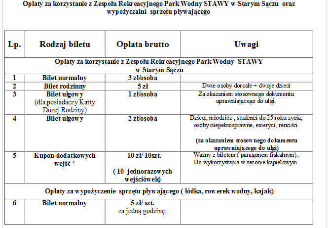 W sezonie od 1.05.2016 r. do 30.09.2016 r. Zespół Rekreacyjny Park Wodny w Starym Sączu odwiedziły 49 592 osoby. Opłaty za wejście pobierane były tylko w sezonie kąpielowym tj. od 15.06 do 30.09.2016 r. Łączne wpływy z tytułu wejść i wypożyczenia sprzętu wyniosły 84.361,20 zł w tym 10.720,00 to wpływy z wypożyczenia sprzętu pływającego. Ze sprzętu pływającego skorzystały 6.462 osoby. Obsługę ratowniczą zgodnie z zawartą umową sprawowało Sądeckie WOPR (koszt 88 560,00 zł).