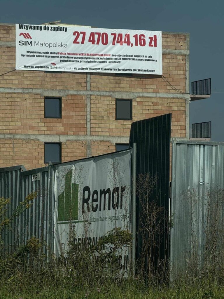 Dzisiaj na jednej z inwestycji w Starym Sączu realizowanych przez SIM Małopolska spółkę w ramach programu Społecznej Inicjatywy Mieszkaniowej, firma Remar wywiesiła baner informujący o konieczności wypłaty zaległych środków w wysokości przekraczającej 27 mln zł. W reakcji próbowaliśmy uzyskać oficjalne stanowisko SIM Małopolska — do chwili publikacji artykułu stanowisko spółki nie wpłynęło.