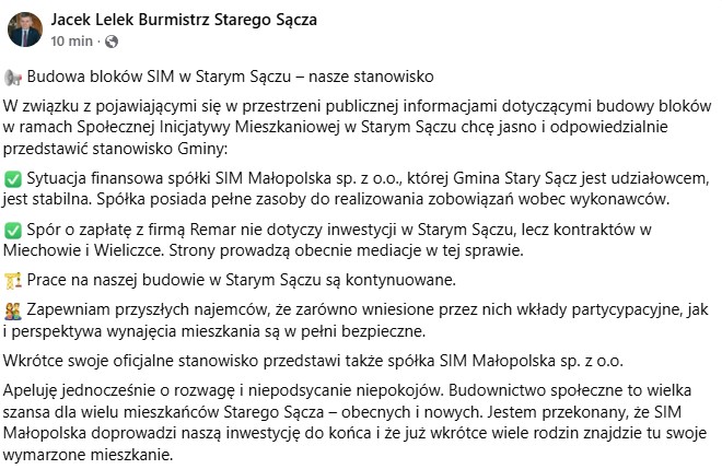 Stanowisko opublikował także burmistrz Starego Sącza Jacek Lelek: