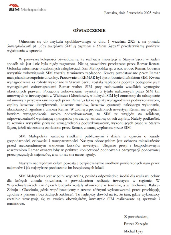 AKTUALIZACJA. Do naszej redakcji wpłynęło OŚWIADCZENIE SIM MAŁOPOLSKA. Prezes Zarządu podkreśla, że inwestycja w Starym Sączu nie jest i nie była zagrożona.