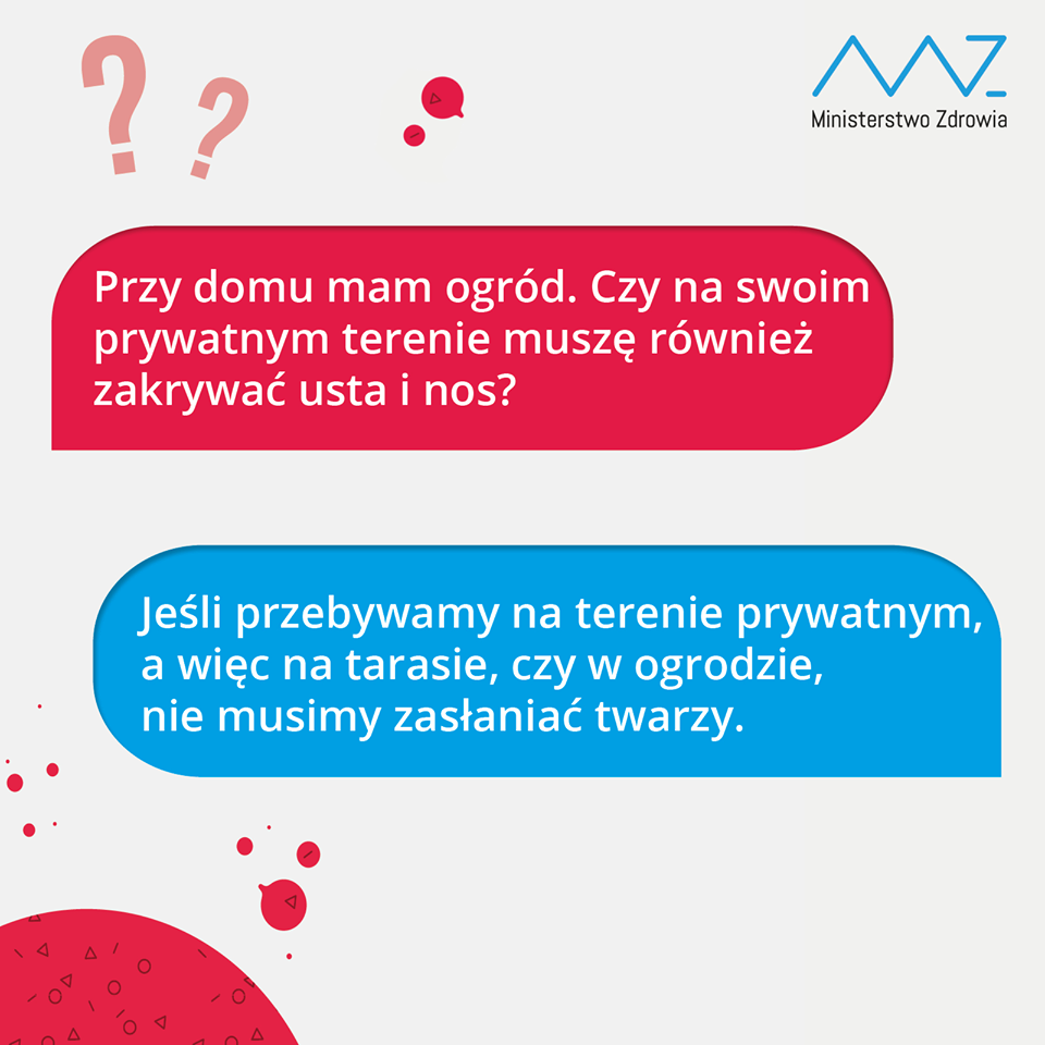 Należy zakrywać twarz – np. za pomocą maseczki – w środkach transportu zbiorowego i samochodzie, jeśli podróżujemy z osobą, która nie mieszka z nami, na drogach i placach, na terenie cmentarzy, parków, zieleńców i miejsc postoju pojazdów. Nie trzeba natomiast zakrywać ust i nosa będąc w lesie. Wyjątkiem jest na parking leśny.