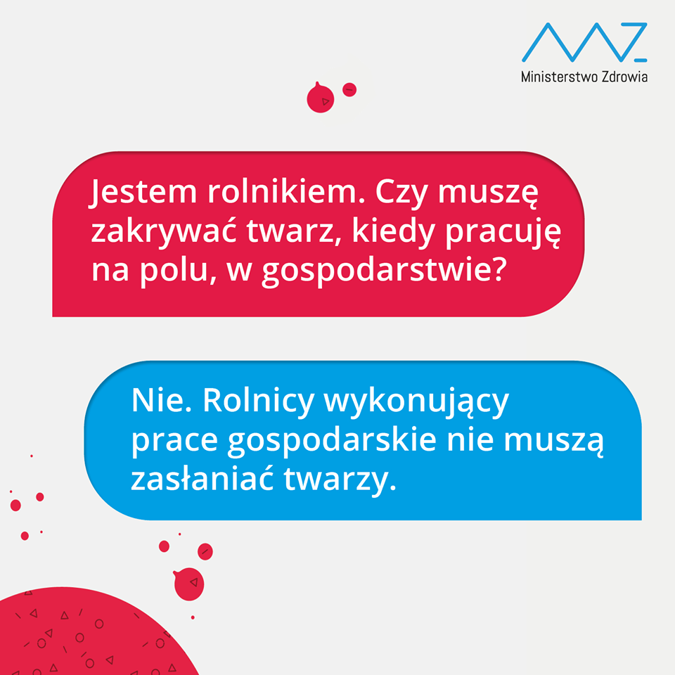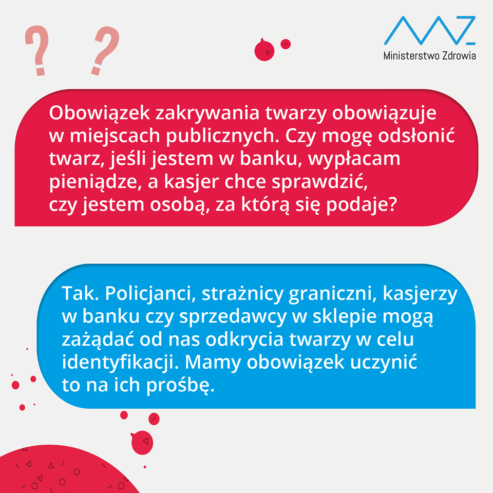 Maseczek nie muszą nosić też duchowni sprawujący obrzędy religijne, pracownicy, którzy nie obsługują interesantów, czy żołnierze wykonujący zadania służbowe. Odkryć usta i nos należy w razie konieczności identyfikacji lub weryfikacji tożsamości lub by umożliwić kontakt z osobą głuchą lub głuchoniemą. Z obowiązku noszenia maseczki zwolnione są dzieci do 4. roku życia oraz osoby chore, dla których zakrywanie twarzy wiąże się z pogorszeniem stanu zdrowia.