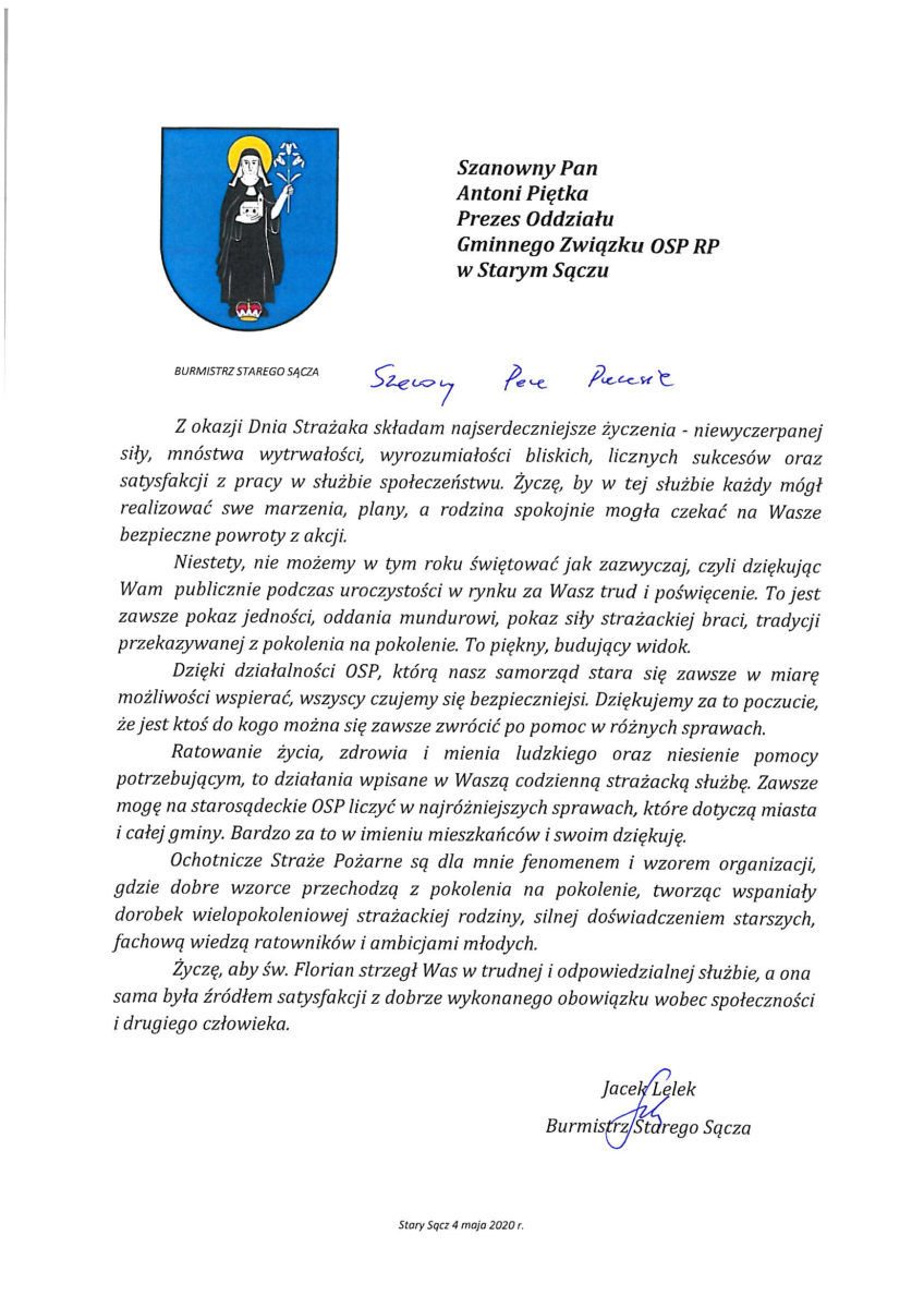W tym roku strażackiej parady w rynku nie będzie, ale pamiętamy o naszych ochotniczych jednostkach. Listy z życzeniami od burmistrza Jacka Lelka trafiły do wszystkich prezesów jednostek działających pod gminnym zarządem OSP.