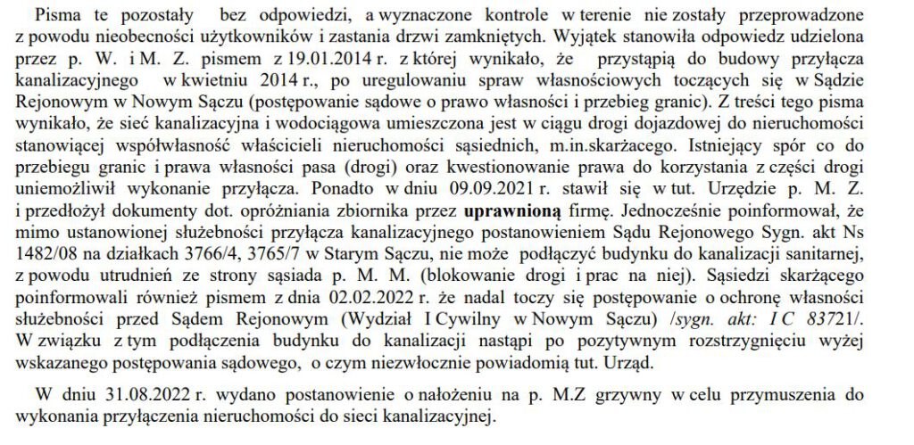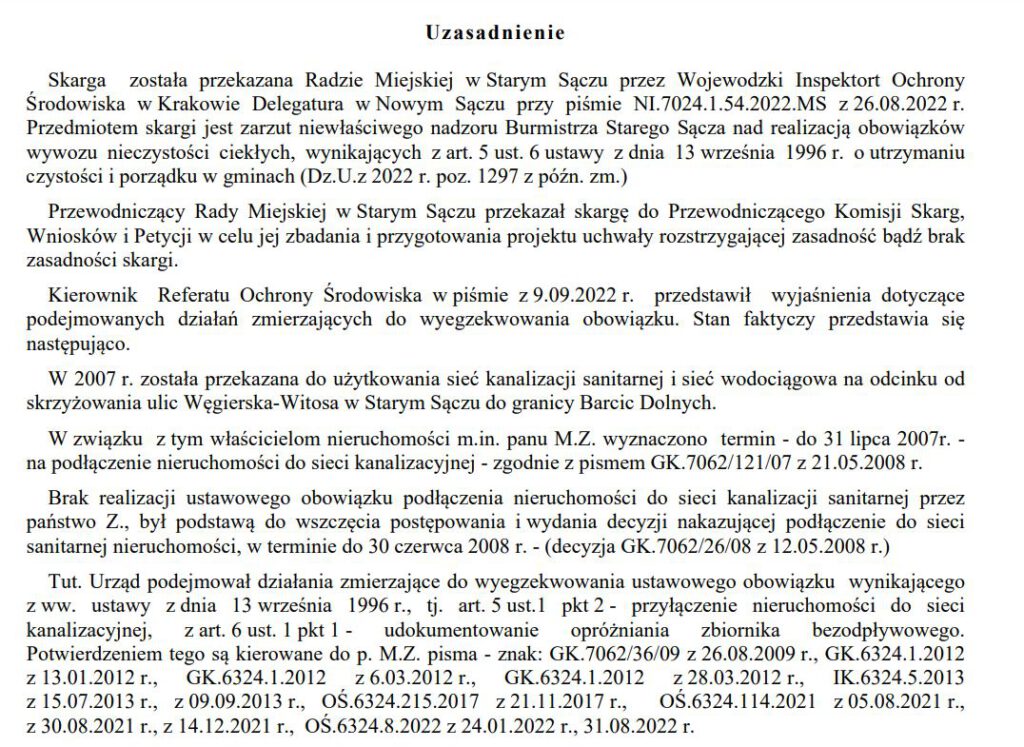 Z kolei druga skarga dotyczyła niewłaściwego nadzoru Burmistrza Starego Sącza nad realizacją obowiązków wywozu nieczystości ciekłych. Skarga została przekazana Radzie Miejskiej w Starym Sączu przez Wojewódzki Inspektorat Ochrony Środowiska w Krakowie Delegatura w Nowym Sączu.
