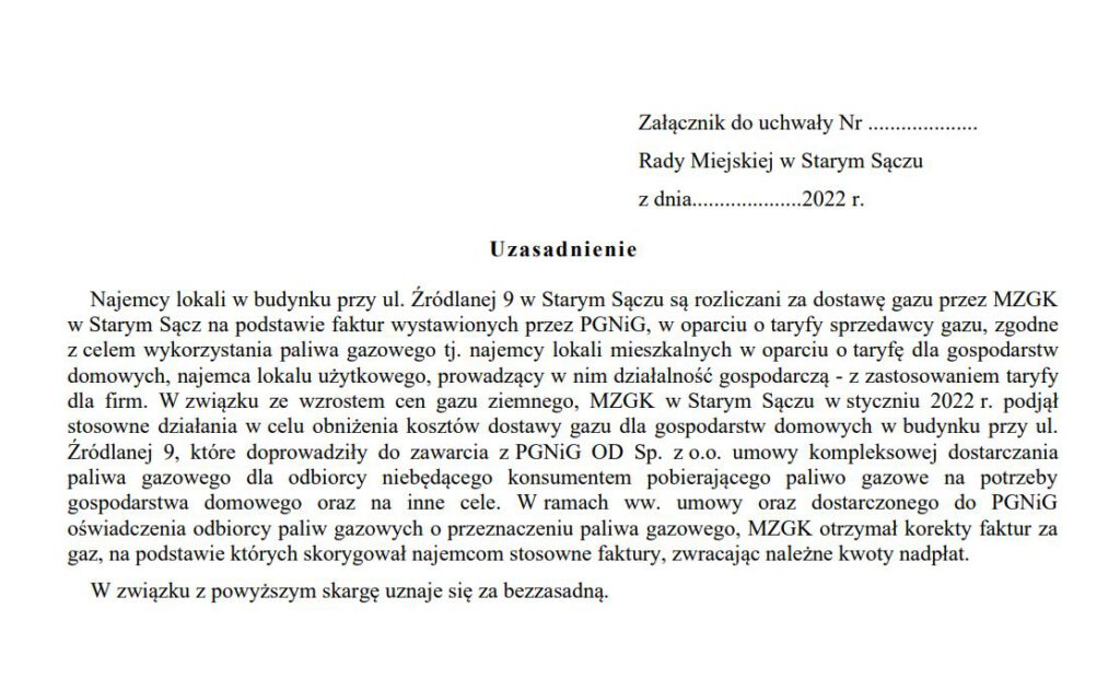 Pierwsza skarga dotyczyła nieprawidłowości w rozliczaniu gazu dostarczanego do mieszkań stanowiących własność Gminy Stary Sącz.