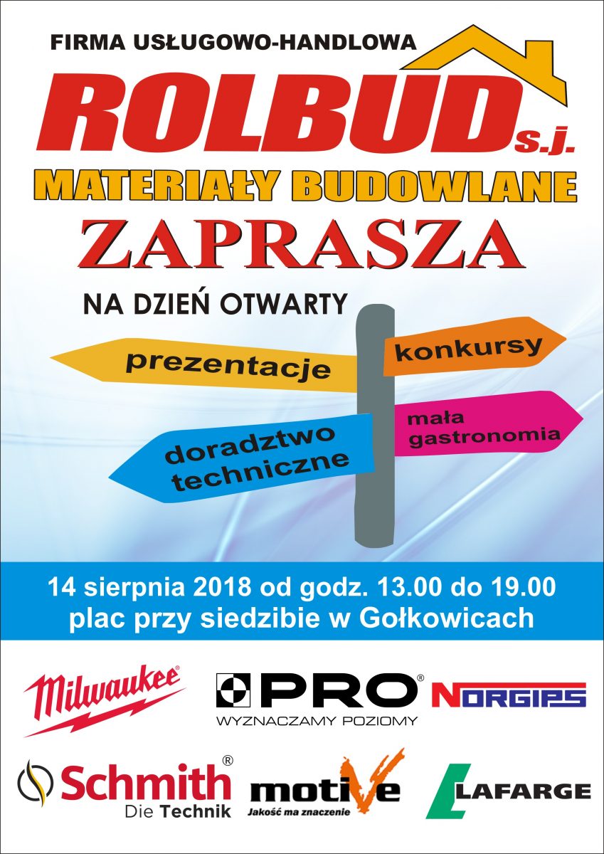 Firma Usługowo-Handlowa „Rolbud” zaprasza na dzień otwarty, który odbędzie się 14 sierpnia, tj. wtorek od godziny 13.00 do 19.00 na placu przy siedzibie firmy w Gołkowicach. Targi stanowią niepowtarzalną okazję do prezentacji produktów, wymiany doświadczeń oraz odbycia spotkań z naszymi partnerami handlowymi. Podczas targów będą Państwo mieli możliwość zapoznania się z naszą ofertą.