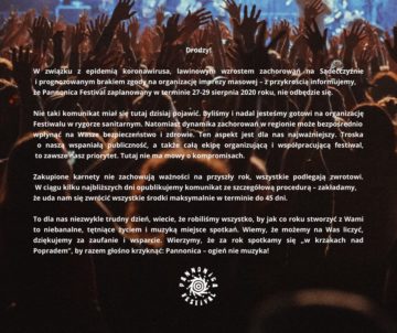 Tegoroczna edycja Festiwalu Pannonica w Barcicach zostaje odwołana. Taki komunikat wydali Organizatorzy. Jest to pokłosie szalejącej na Sądecczyźnie epidemii koronawirusa a także sprzeciwu mieszkańców trzech sołectw o którym pisaliśmy TUTAJ.