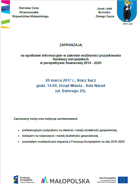 Wicemarszałek Województwa Małopolskiego Stanisław Sorys i burmistrz Starego Sącza Jacek Lelek zapraszają na spotkanie informacyjne dotyczące funduszy unijnych w perspektywie 2014-2020, które odbędzie się 20 marca w Sali Narad Urzędu Miejskiego w Starym Sączu.