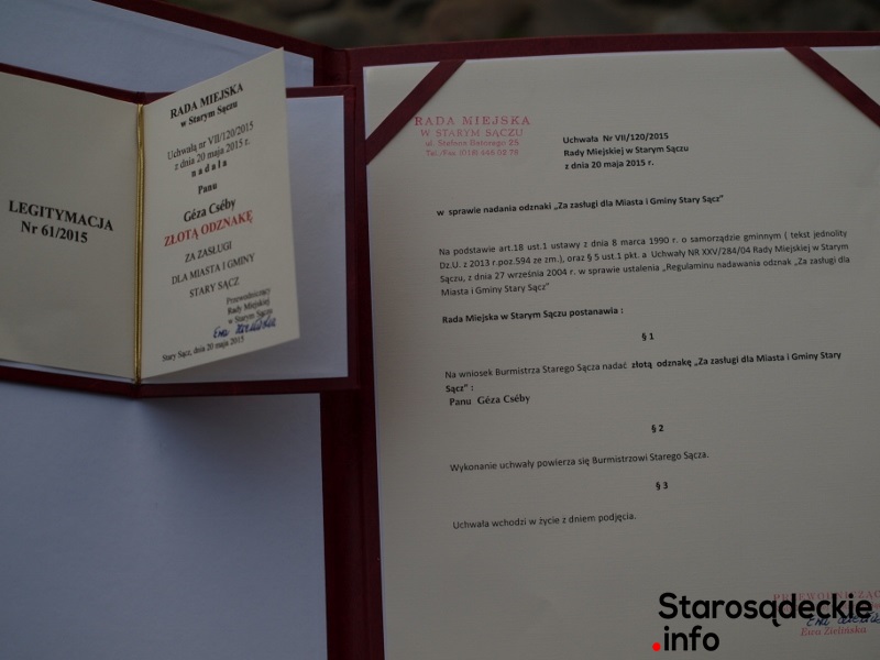 Podczas pierwszego dnia Jarmarku Rzemiosła w Starym Sączu Cséby Géza -poeta, tłumacz, znawca literatury, w którego żyłach płynie polska i węgierska krew – został odznaczony złotą odznaką „Za zasługi dla Miasta i Gminy Stary Sącz”. Odznaczenie wręczyła Ewa Zielińska, przewodnicząca Rady Miejskiej i wiceburmistrz Kazimierz Gizicki.
