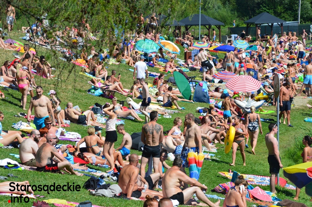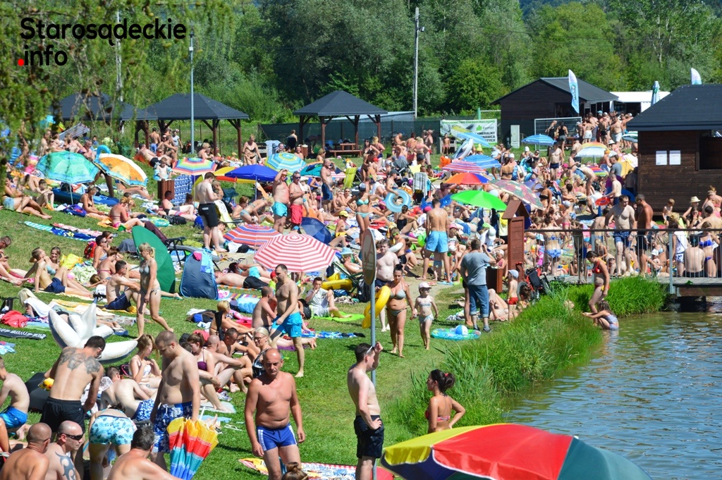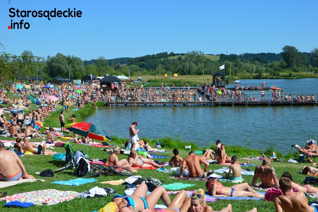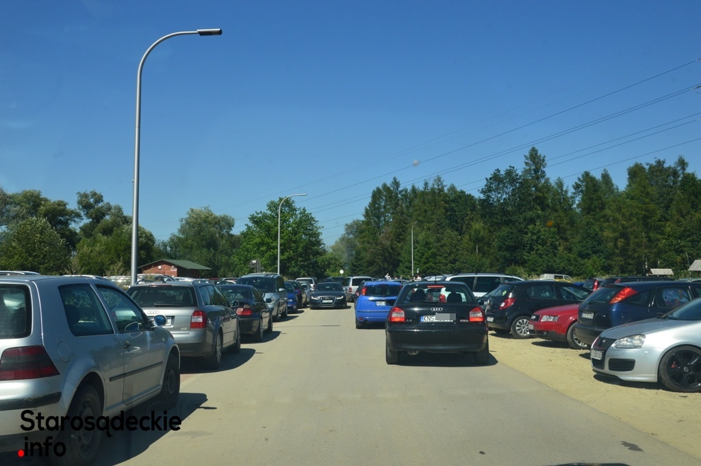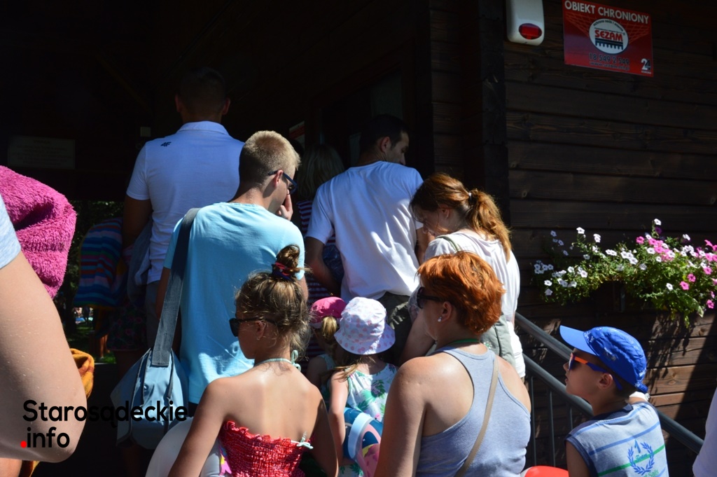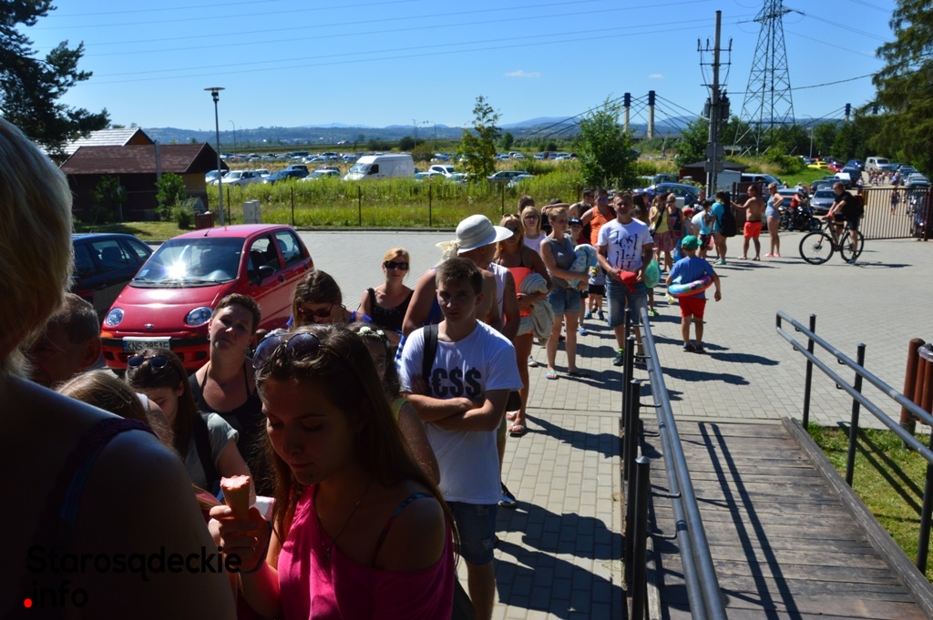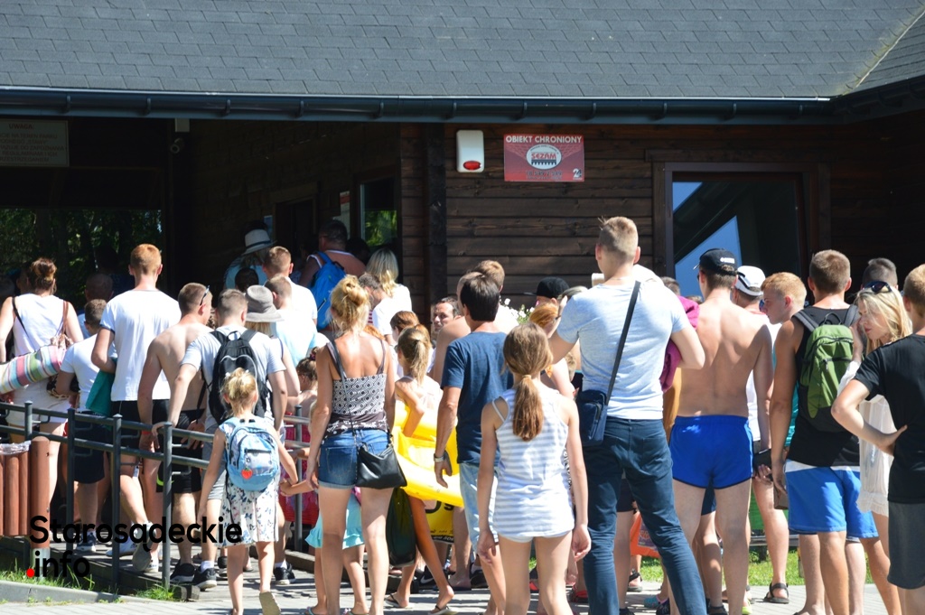 Jeśli chcieliście dziś wybrać się na starosądeckie Stawy, musicie liczyć się z tym, że trochę poczekacie przed wejściem. Temperatura wzrosła, słońce pięknie świeci, nic więc dziwnego, że tłumy ruszyły nad wodę. Przed wejściem stoi kilkudziesięciometrowa kolejka. Zdjęcia wykonane dzisiaj (30 lipca) przed godziną 14:00.