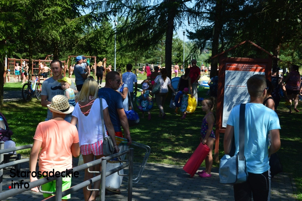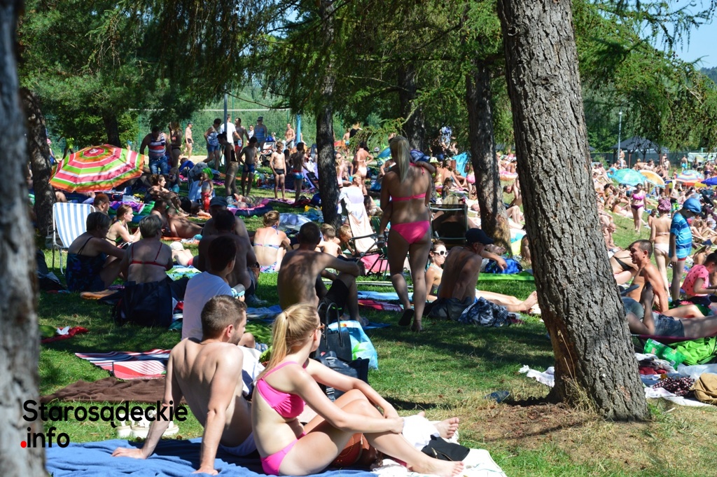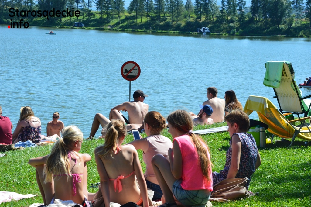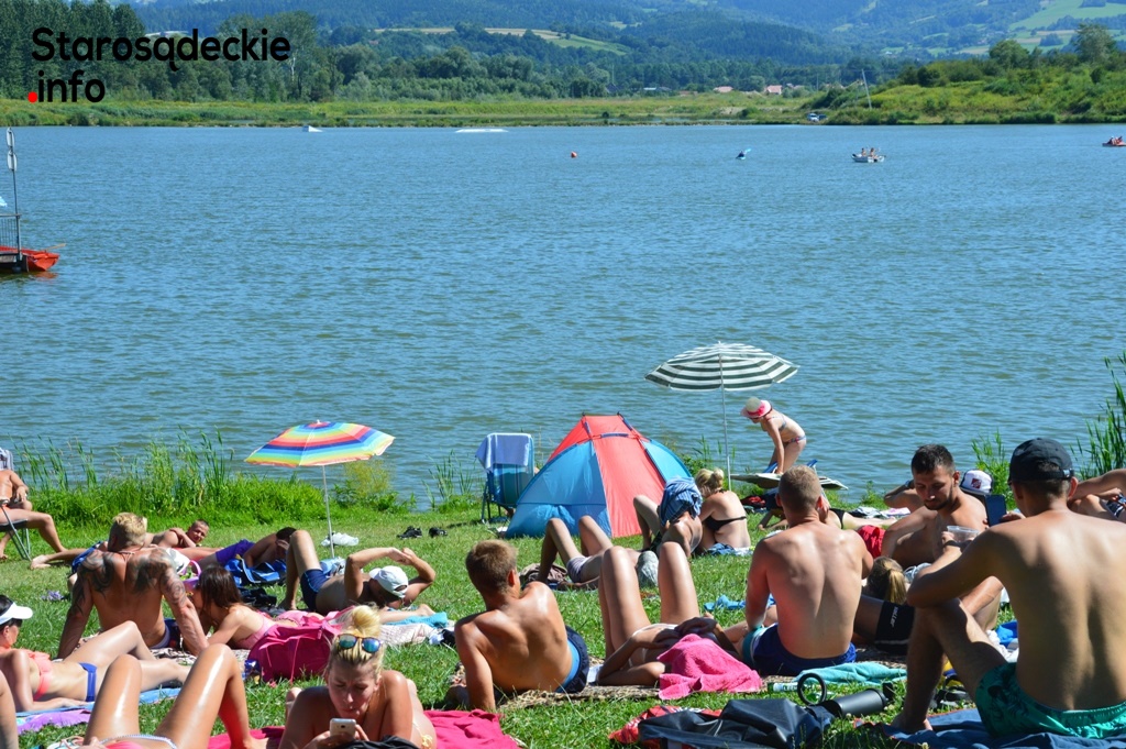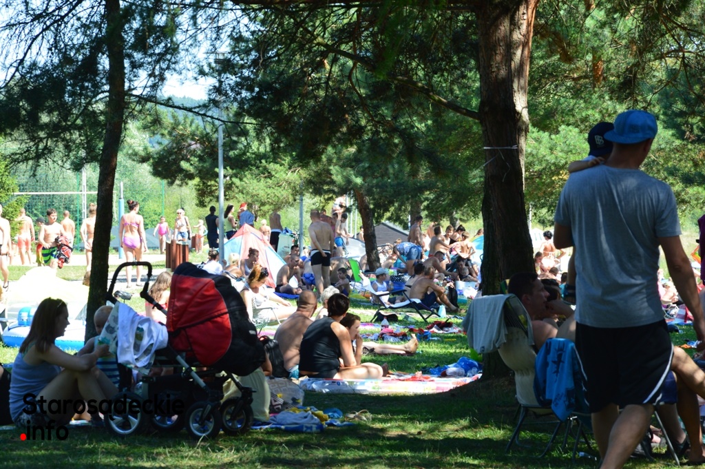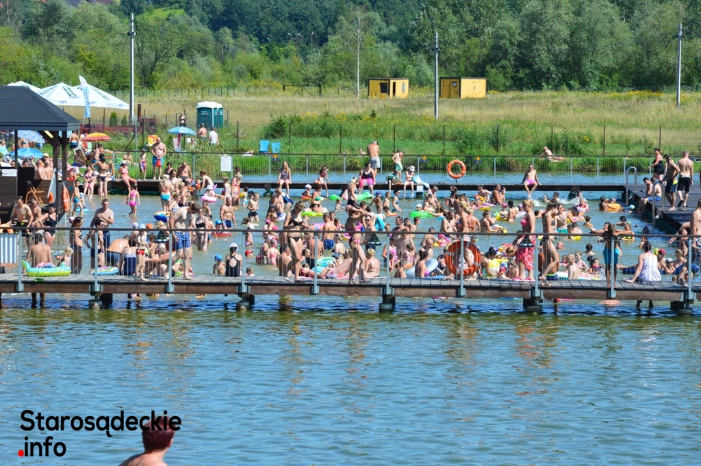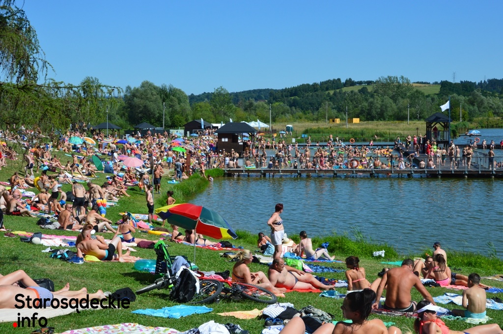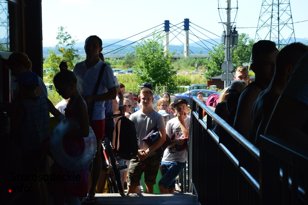 Jeśli chcieliście dziś wybrać się na starosądeckie Stawy, musicie liczyć się z tym, że trochę poczekacie przed wejściem. Temperatura wzrosła, słońce pięknie świeci, nic więc dziwnego, że tłumy ruszyły nad wodę. Przed wejściem stoi kilkudziesięciometrowa kolejka. Zdjęcia wykonane dzisiaj (30 lipca) przed godziną 14:00.