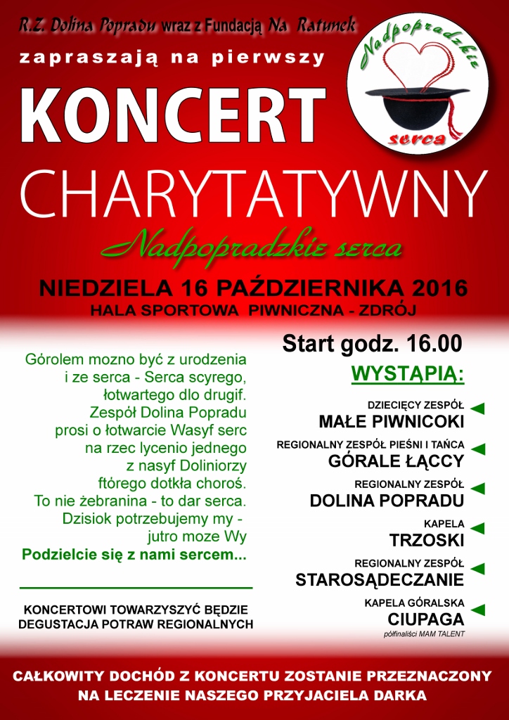 Regionalny Zespół „Dolina Popradu” w Piwnicznej i Fundacja  NA RATUNEK przy współudziale ludzi kochających region, serdecznie zapraszają na koncert charytatywny „Nadpopradzkie serca” do Hali Sportowej w Piwnicznej.