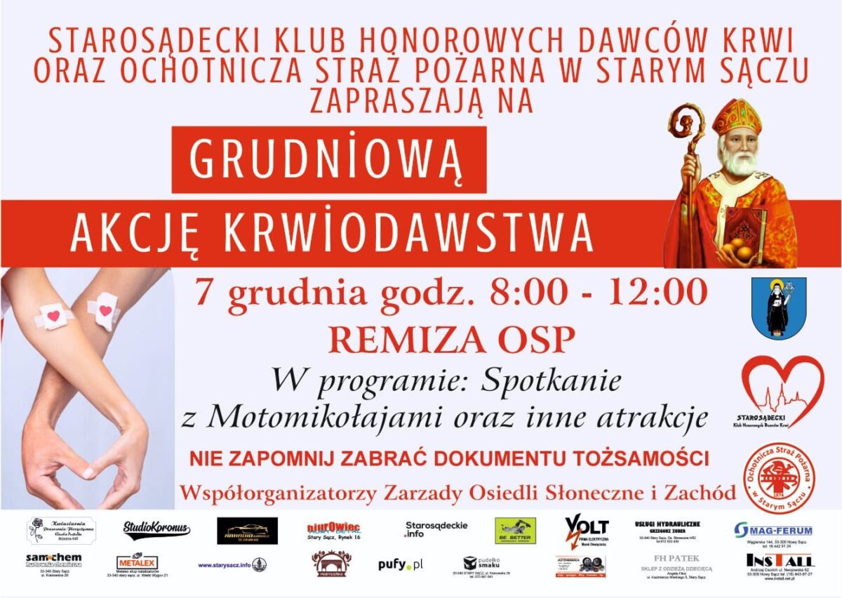 Już 7 grudnia w Starym Sączu odbędzie się wyjątkowa, Mikołajkowa akcja oddawania krwi organizowana przez Starosądecki Klub Honorowych Dawców Krwi i OSP Stary Sącz. To doskonała okazja, by w przedświątecznej atmosferze zrobić coś dobrego – pomóc tym, którzy najbardziej potrzebują naszej krwi.