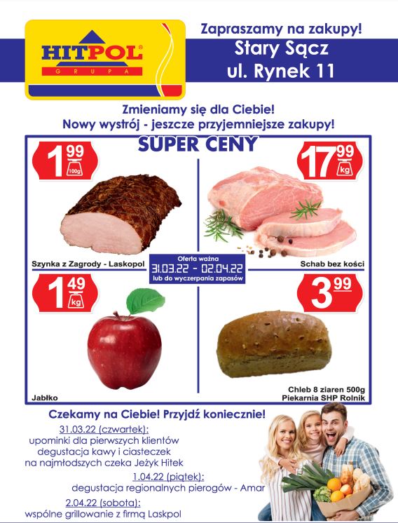 Spółdzielnia Handlowo-Produkcyjna „Rolnik” zaprasza na otwarcie sklepu sieci Hitpol w Starym Sączu już w czwartek 31.03.2022. Dla pierwszych klientów upominki, degustacja wypieków ciastkarni SHP, promocje oraz atrakcje dla najmłodszych.