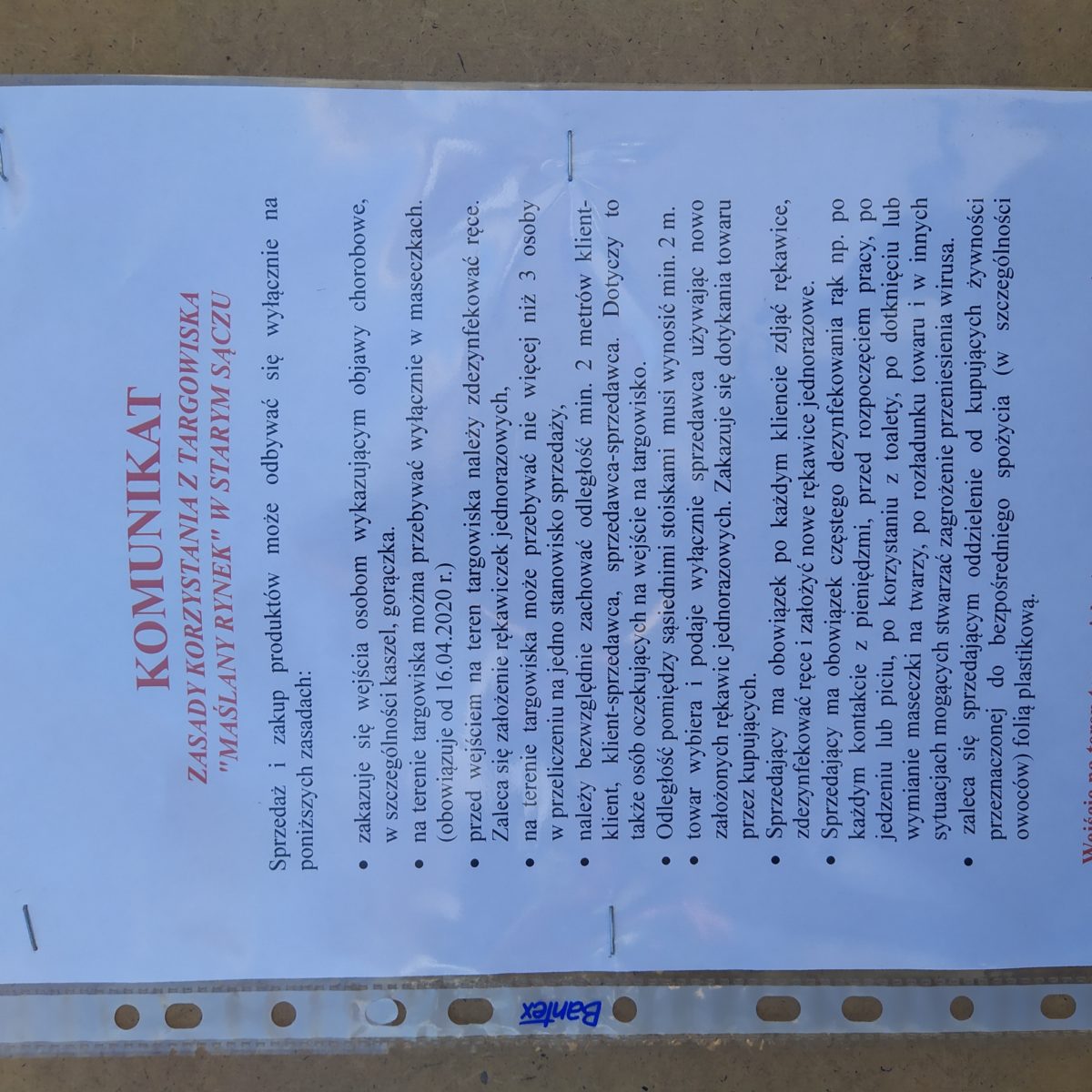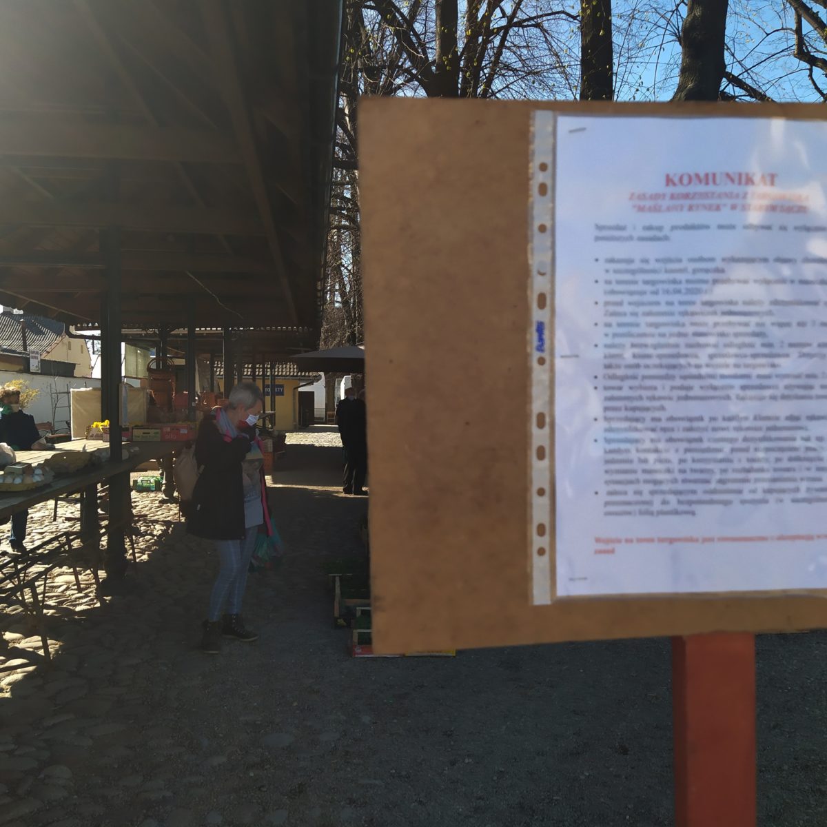 Zgodnie z najnowszymi wytycznymi na terenie targowiska można przebywać tylko w maseczkach. Zabronione jest wejście osobom wykazującym objawy chorobowe, w szczególności kaszel i gorączka. Przed wejściem należy zdezynfekować ręce i na jego terenie może przebywać nie więcej niż 3 osoby w przeliczeniu na 1 stanowisko. Obowiązuje także zakaz dotykania towaru a sprzedający ma obowiązek po każdym kliencie zdezynfekować ręce i zmienić rękawiczki.