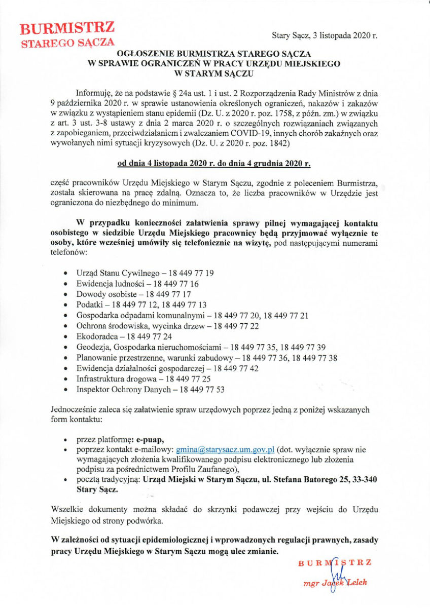 Od 4 listopada do 4 grudnia 2020 r. część pracowników Urzędu Miejskiego w Starym Sączu została skierowana na pracę zdalną. Obsada w urzędzie będzie zapewniała załatwianie najpilniejszych spraw po wcześniejszym umówieniu telefonicznym. Prosimy na ile to możliwe o załatwianie spraw urzędowych przez platformę e-puap, poprzez e-mail i pocztą tradycyjną.