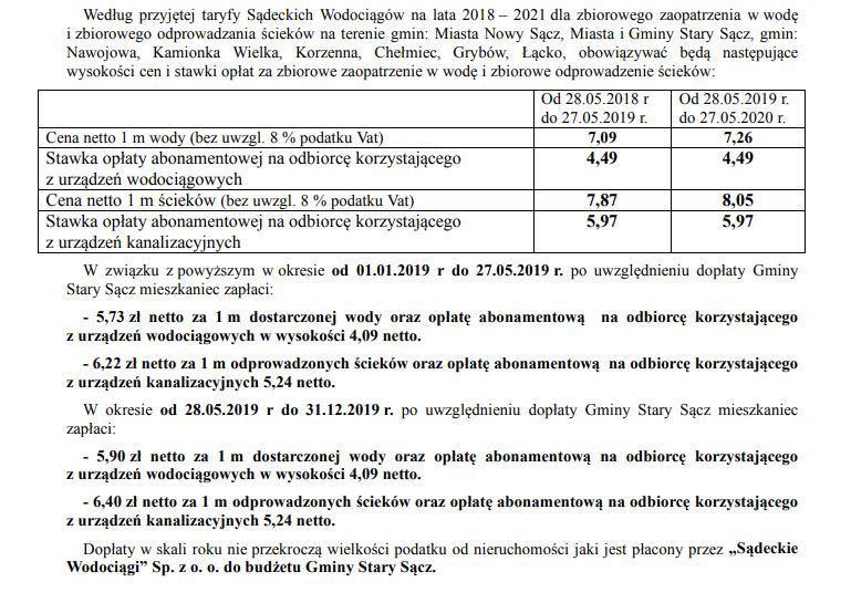 –Pewne rzeczy są nieuniknione–dodaje burmistrz Jacek Lelek –pewne rzeczy wynikają z sytuacji globalnej. Nie są to podwyżki, które drastycznie będą zmieniały sytuację naszych rodzin. To rzecz mało przyjemna i chcielibyśmy ich uniknąć, ale z drugiej strony jest konieczność abyśmy gospodarowali w taki sposób , żeby pewne usługi finansowały się same. Jeżeli produkujemy coraz więcej śmieci to musimy liczyć się z tym, że za zagospodarowanie tych odpadów będziemy musieli więcej zapłacić. Tutaj gmina nie zarabia. Ufam, że nie zarabiają także niekontrolowane firmy, bo wybieramy firmy w konkurencyjnym przetargu. W przypadku podwyżki za wodę i ścieki, to jest to podwyżka Sądeckich Wodociągów. Jest ona minimalna. Gmina także znacząco dopłacała mieszkańcom za każdy m3. Zastanawiamy się nad sprawiedliwym rozwiązaniem. Tak aby Ci, którzy korzystają z dobrodziejstwa wody i odprowadzeniu ścieków-sami ponosili koszty własne, tyle ile to kosztuje. Coraz więcej osób przyłącza się do kanalizacji, więc tych kubików będzie więcej. Jeśli my mamy stałą dopłatę do kubika to te dopłaty z budżetu gminy musiałyby wzrosnąć. To nie jest żadna oszczędność gminy. To podzielenie tych pieniędzy na trochę większą liczbę użytkowników. Musimy solidarnie te koszty ponosić.