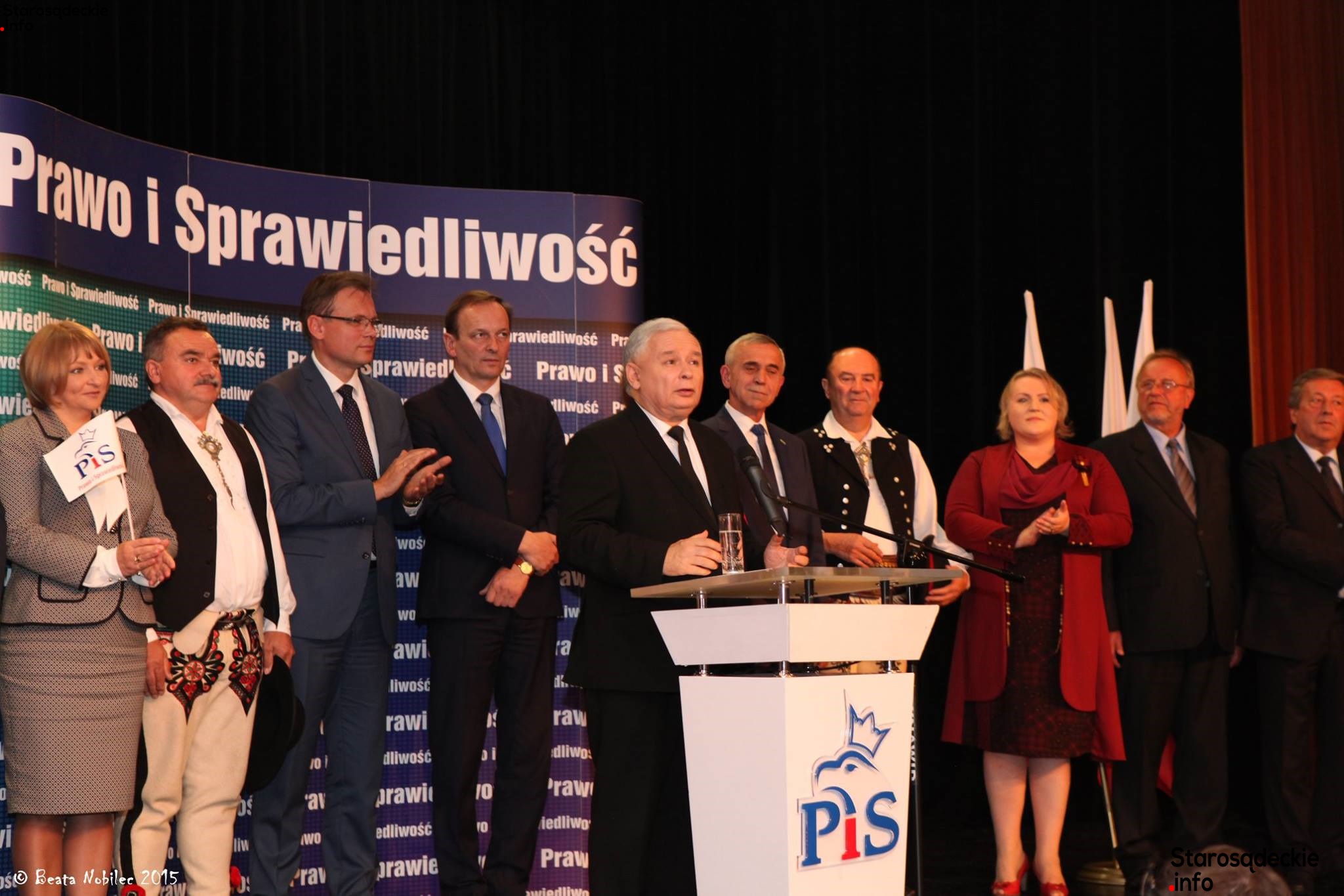 –W ostatnich latach przyjeżdżam do Nowego Sączu,a bywam tutaj często. Mam poczucie głębokiej satysfakcji. To miejsce w Polsce, które się znakomicie rozwija. Bardzo bym chciał, by Polska w całości rozwijała się tak jak Nowy Sącz. (…) –mówił Jarosław Kaczyński -Bardzo dobrze by było, żeby wielu mieszkańców tej ziemi znalazło się w parlamencie. Chcę powiedzieć, że to bardzo mocna lista, naprawdę bardzo mocna lista. To doświadczeni działacze, którzy jak Piotr Naimski mają już dziesięciolecia pracy politycznej. (…) O to zwycięstwo trzeba ciągle walczyć, ciągle pracować, ono nie przyjdzie samo. PO jest dziś reprezentantem pełnego wad systemu. Cofa się, ale ma coraz więcej różnych pomocników, różnych mniejszych partii, które rzuciły się po to, żeby temu pomóc. Ten system marnuje nasz potencjał, a Nowy Sącz pokazuje, że ten potencjał jest wielki. Musimy pokonać ich wszystkich, musimy przekonać naszych rodaków, że jedyna stawka, na którą warto głosować to PiS. To partia, która jeśli będzie mogła rządzić samodzielnie, stworzy znakomity rząd pod przewodnictwem Beaty Szydło. Powtarzam: musimy uczynić bardzo wiele, by to zwycięstwo, nasze zwycięstwo, było zwycięstwem pełnym, żebyśmy mieli znacznie więcej niż 231 mandatów. To jest nam potrzebne, byśmy mogli pójść szybko do przodu. By to, co w naszym życiu jest złe było już za nami. Byśmy mogli iść w górę bez opóźnień. Ten marsz może nam w stosunkowo niewielkim czasie przynieść ogromne sukcesy, by Polak wyjeżdżający za granicę mógł powiedzieć: „Tam jest dobrze, ale u nas jest tak samo”. (…) Potrzebna jest naprawa naszego aparatu państwowego, potrzebne jest lepsze zorganizowanie władzy wykonawczej, rządu, potrzebna jest reforma sądownictwa i służb mundurowych, potrzebna jest reforma polskiej dyplomacji, potrzebna jest reforma Skarbu Państwa. Potrzebne jest zgromadzenie wielkiego kapitału, który może być uruchomiony i być podstawą wielkiego programu.